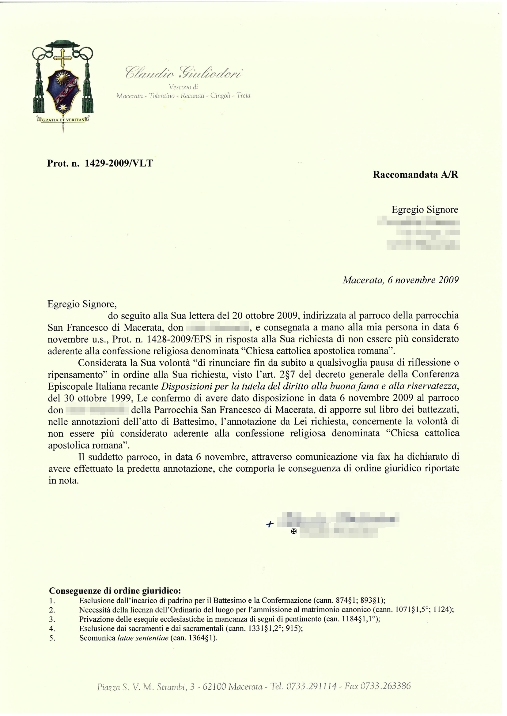 Una persona ha chiesto la rettifica dei dati relativi al proprio battesimo avvenuto a S. Francesco - MACERATA (MC) il 06/11/2009, dichiarando di non voler più far parte della Chiesa Cattolica.