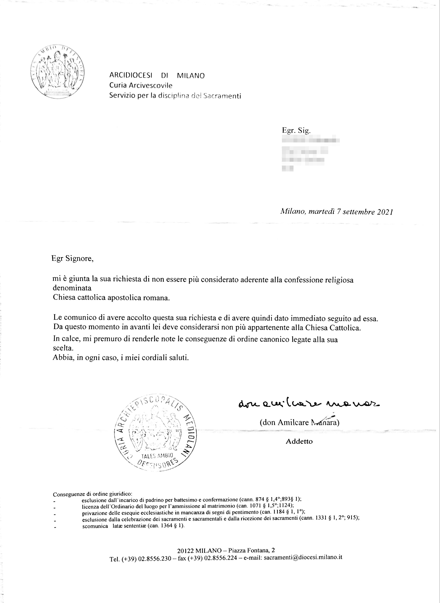 Sbattezzato dopo due raccomandate, la prima chiara e semplice in cui esponevo le mie ragioni, dopo un mese senza risposte la seconda in cui invece mostravo l'intenzione di andare per avvocati per poter concludere lo sbattezzo. Dopo quasi un'altro mese arriva la lettera dell'arcidiocesi di avvenuto sbattezzo. Lo sbattezzo è avvenuto due settimane prima di ricevere la lettera a casa. Bisogna aspettare un po' evidentemente in queste zone. Il prete non ha risposto a nessuna lettera: è arrivata direttamente la risposta dell'arcidiocesi.