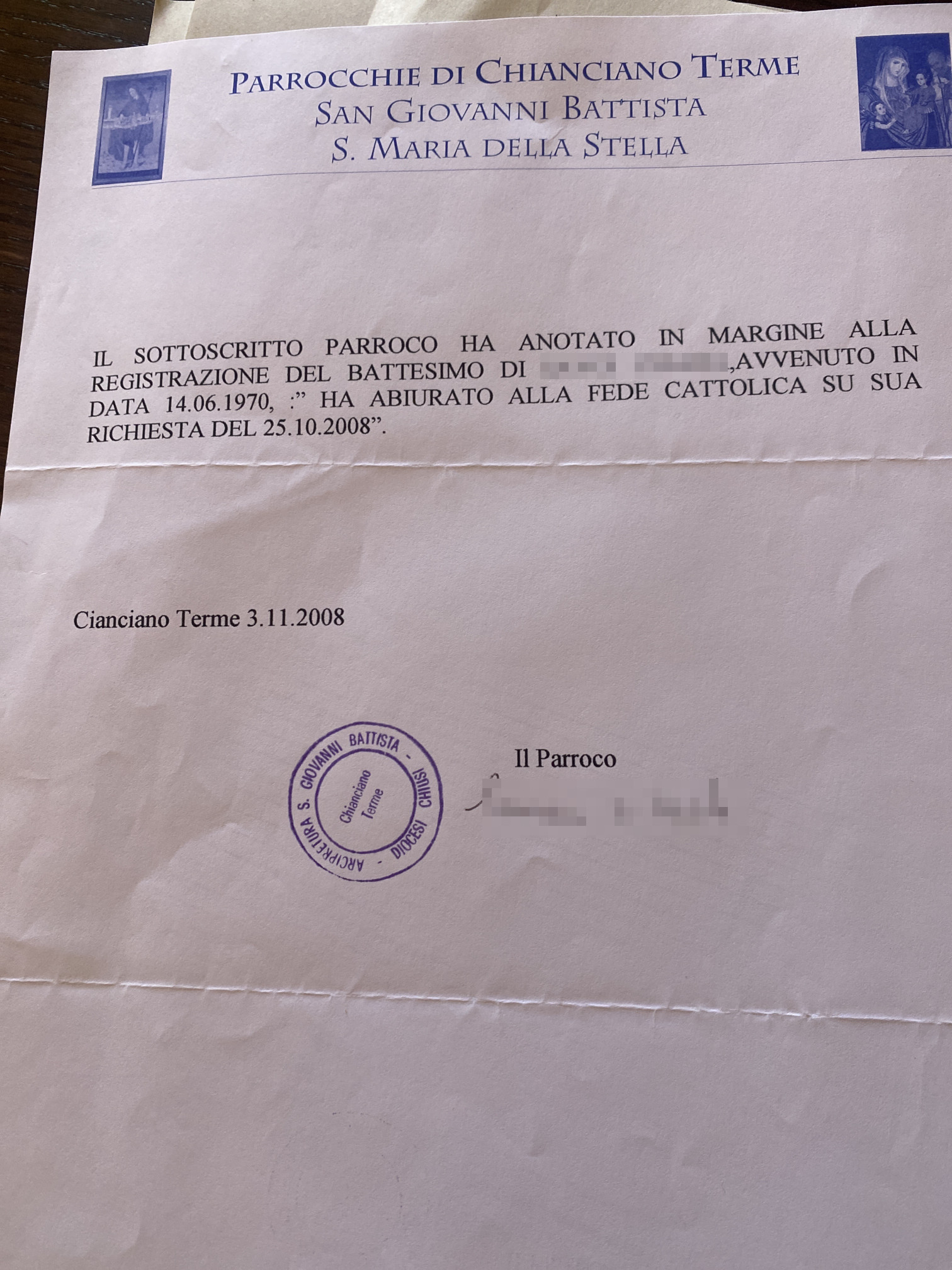 Una persona ha chiesto la rettifica dei dati relativi al proprio battesimo avvenuto a S. Giovanni Battista - CHIANCIANO TERME (SI) il 03/11/2008, dichiarando di non voler più far parte della Chiesa Cattolica.