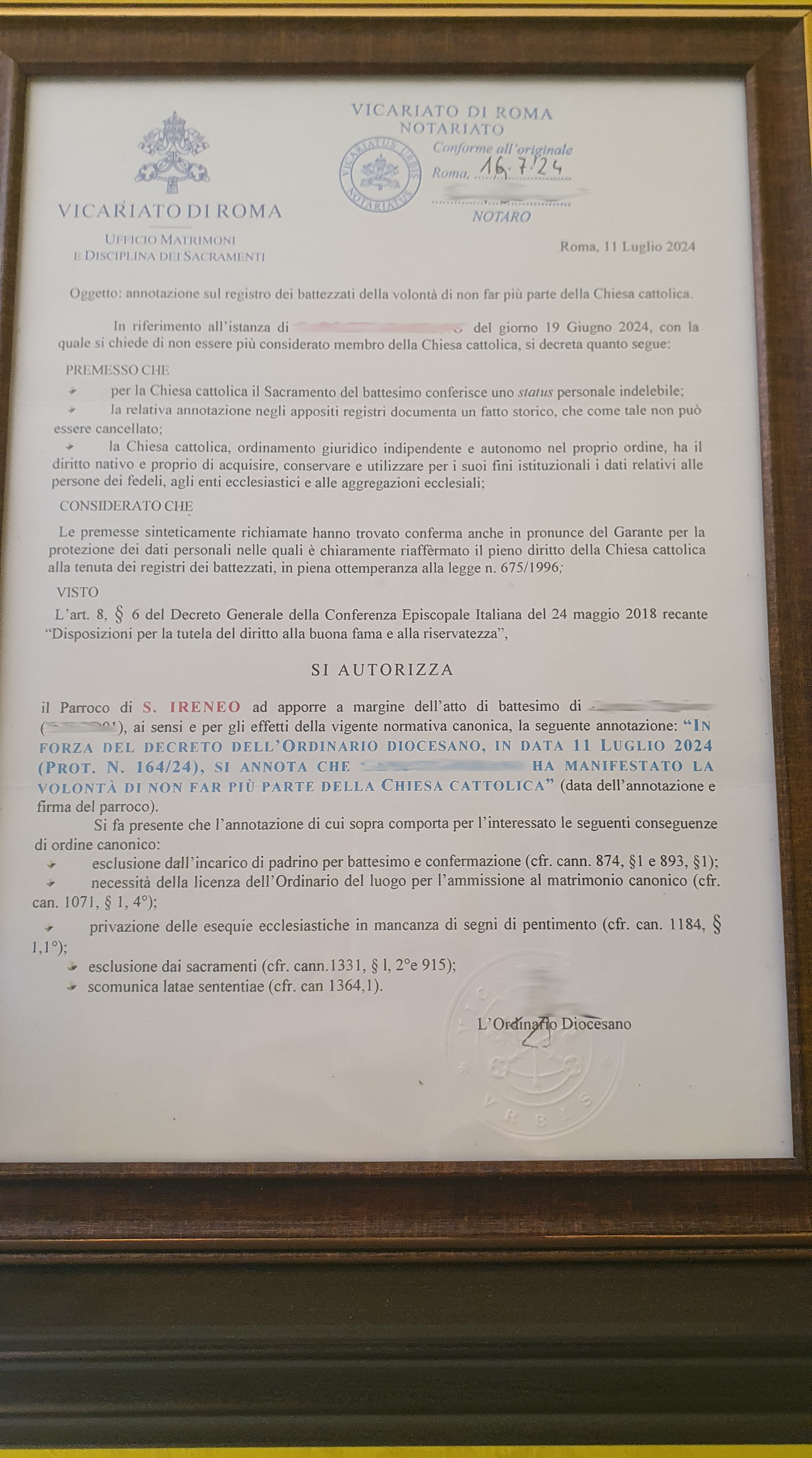 Una persona ha chiesto la rettifica dei dati relativi al proprio battesimo avvenuto a S. Ireneo a Centocelle - ROMA (RM) il 11/07/2024, dichiarando di non voler più far parte della Chiesa Cattolica.
