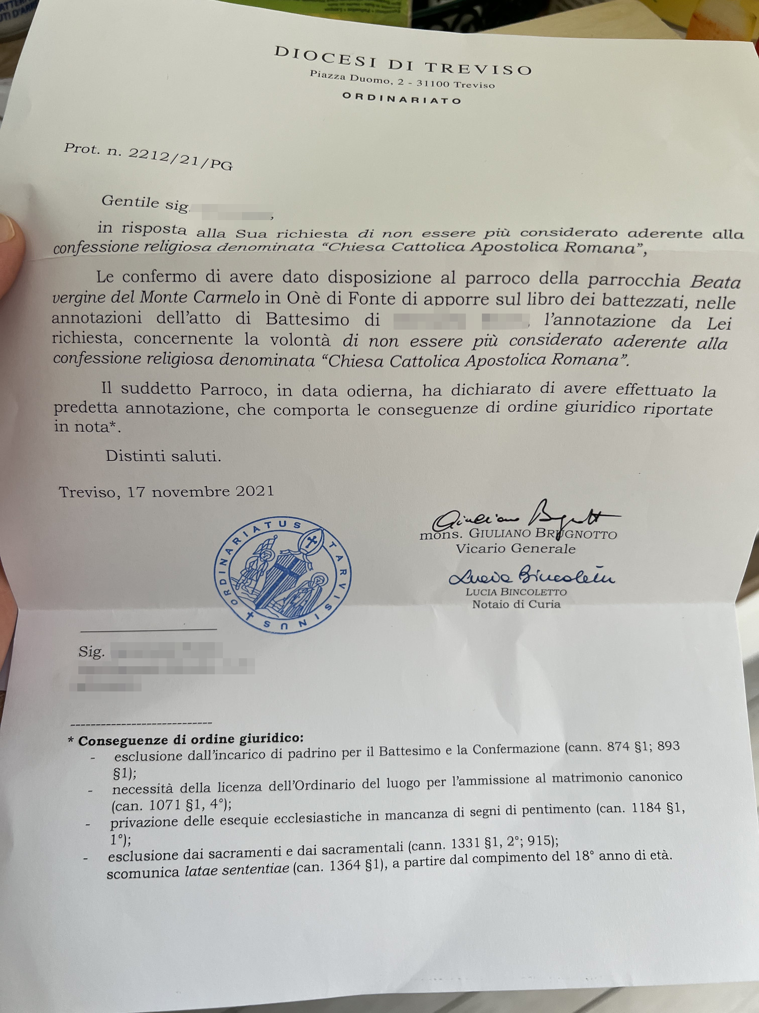 Una persona ha chiesto la rettifica dei dati relativi al proprio battesimo avvenuto a Beata Vergine del Monte Carmelo - FONTE (TV) il 17/11/2021, dichiarando di non voler più far parte della Chiesa Cattolica.