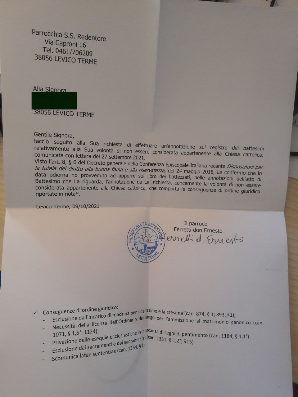 Una persona ha chiesto la rettifica dei dati relativi al proprio battesimo avvenuto a Santissimo Redentore - LEVICO TERME (TN) il 09/10/2021, dichiarando di non voler più far parte della Chiesa Cattolica.