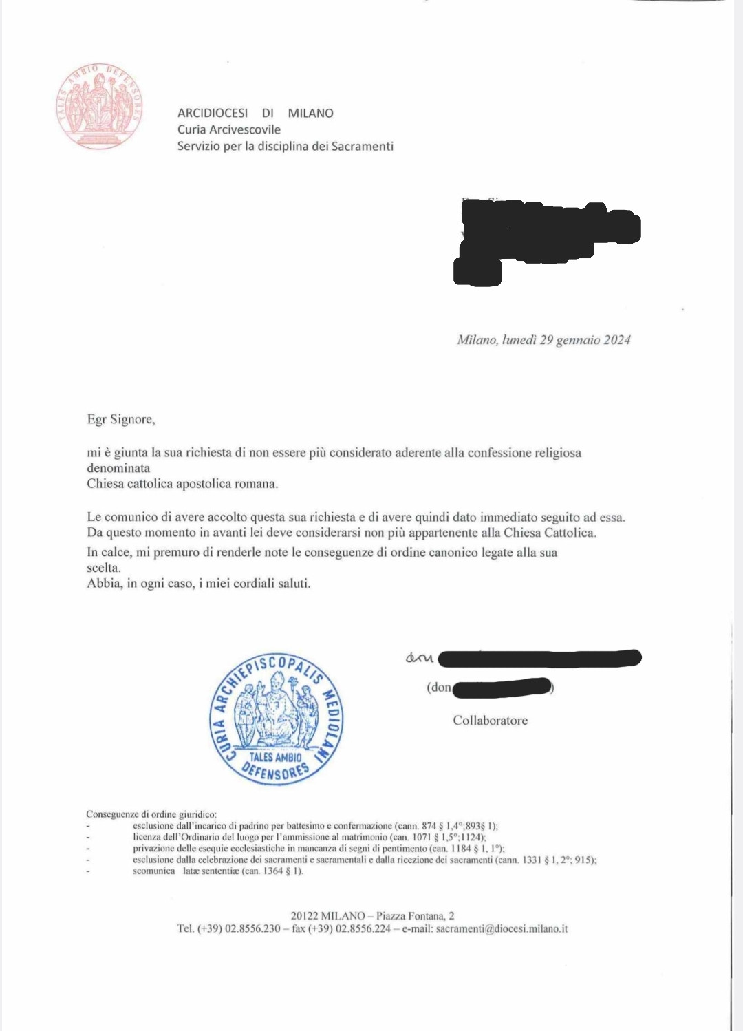 Una persona ha chiesto la rettifica dei dati relativi al proprio battesimo avvenuto a Santi Pietro e Paolo - DERVIO (LC) il 29/01/2024, dichiarando di non voler più far parte della Chiesa Cattolica.
