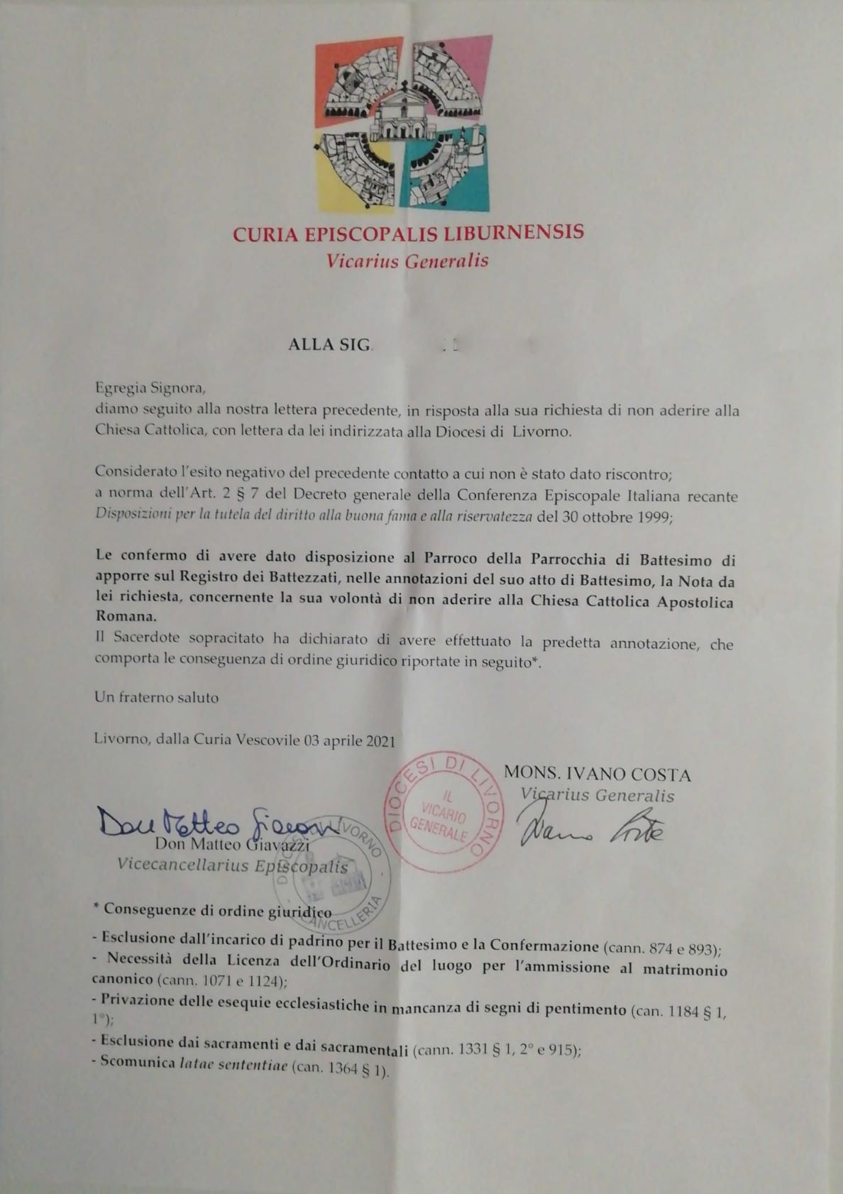 Una persona ha chiesto la rettifica dei dati relativi al proprio battesimo avvenuto a S. Caterina - LIVORNO (LI) il 03/04/2021, dichiarando di non voler più far parte della Chiesa Cattolica.