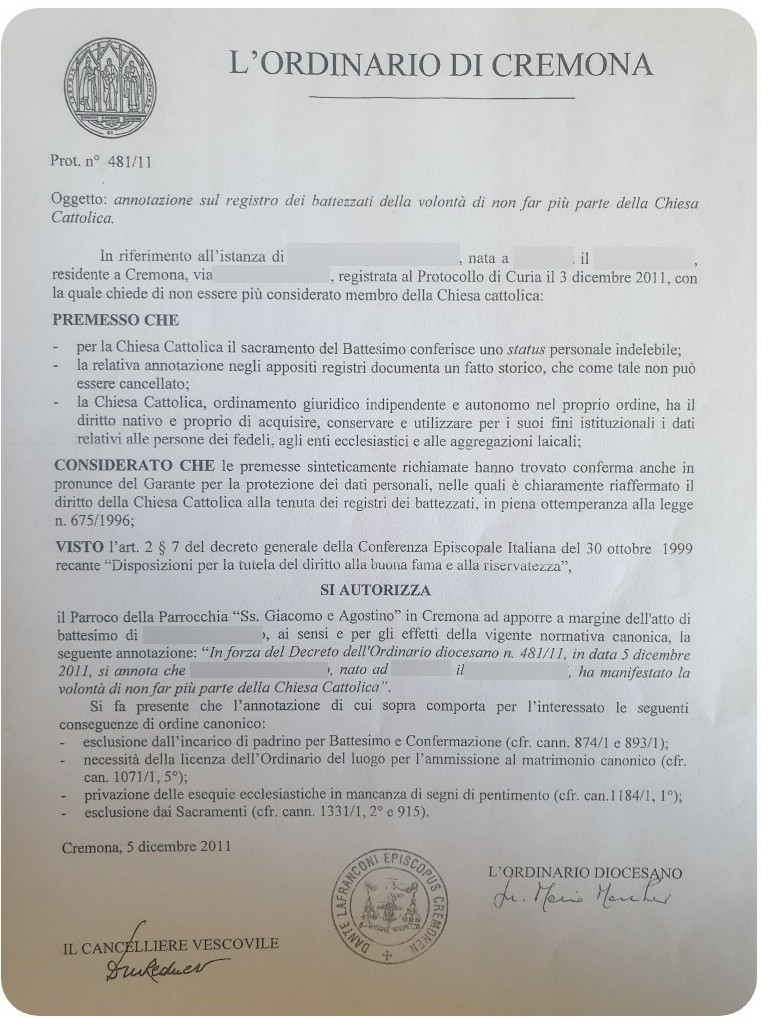 Una persona ha chiesto la rettifica dei dati relativi al proprio battesimo avvenuto a Santi Giacomo e Agostino - CREMONA (CR) il 05/12/2011, dichiarando di non voler più far parte della Chiesa Cattolica.
