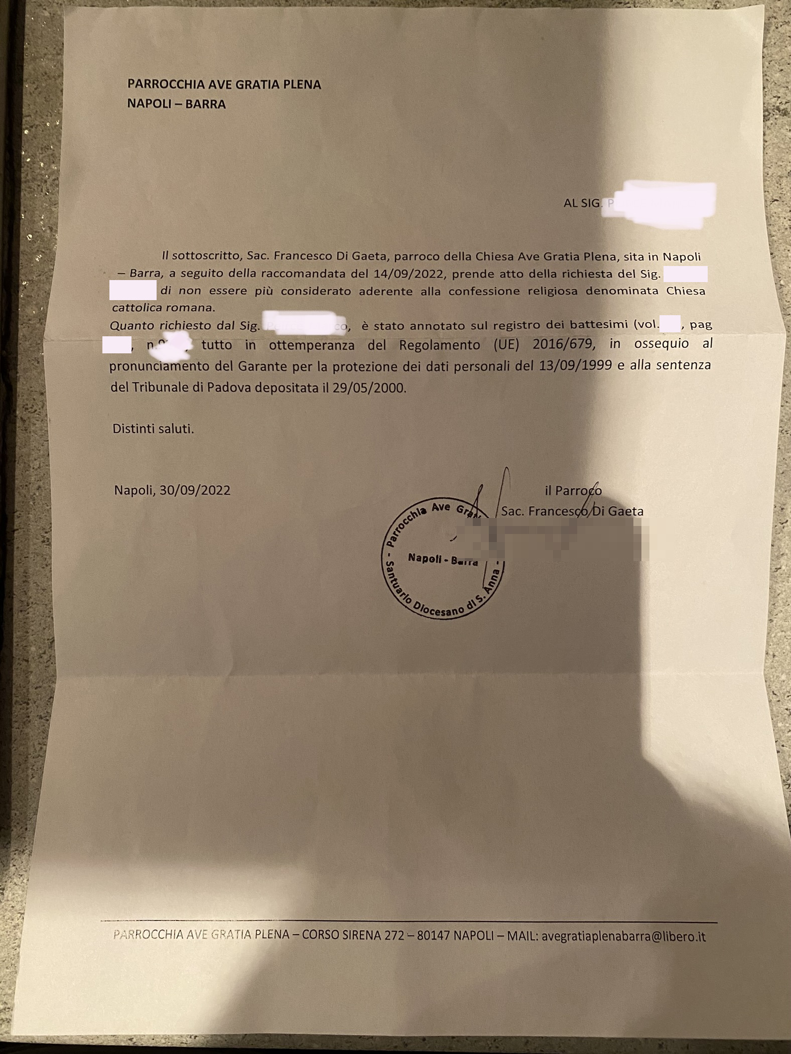 Una persona ha chiesto la rettifica dei dati relativi al proprio battesimo avvenuto a Ave Gratia Plena - NAPOLI (NA) il 30/09/2022, dichiarando di non voler più far parte della Chiesa Cattolica.