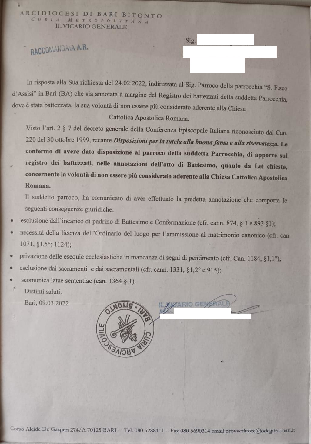 Una persona ha chiesto la rettifica dei dati relativi al proprio battesimo avvenuto a S. Francesco d'Assisi - BARI (BA) il 09/03/2022, dichiarando di non voler più far parte della Chiesa Cattolica.
