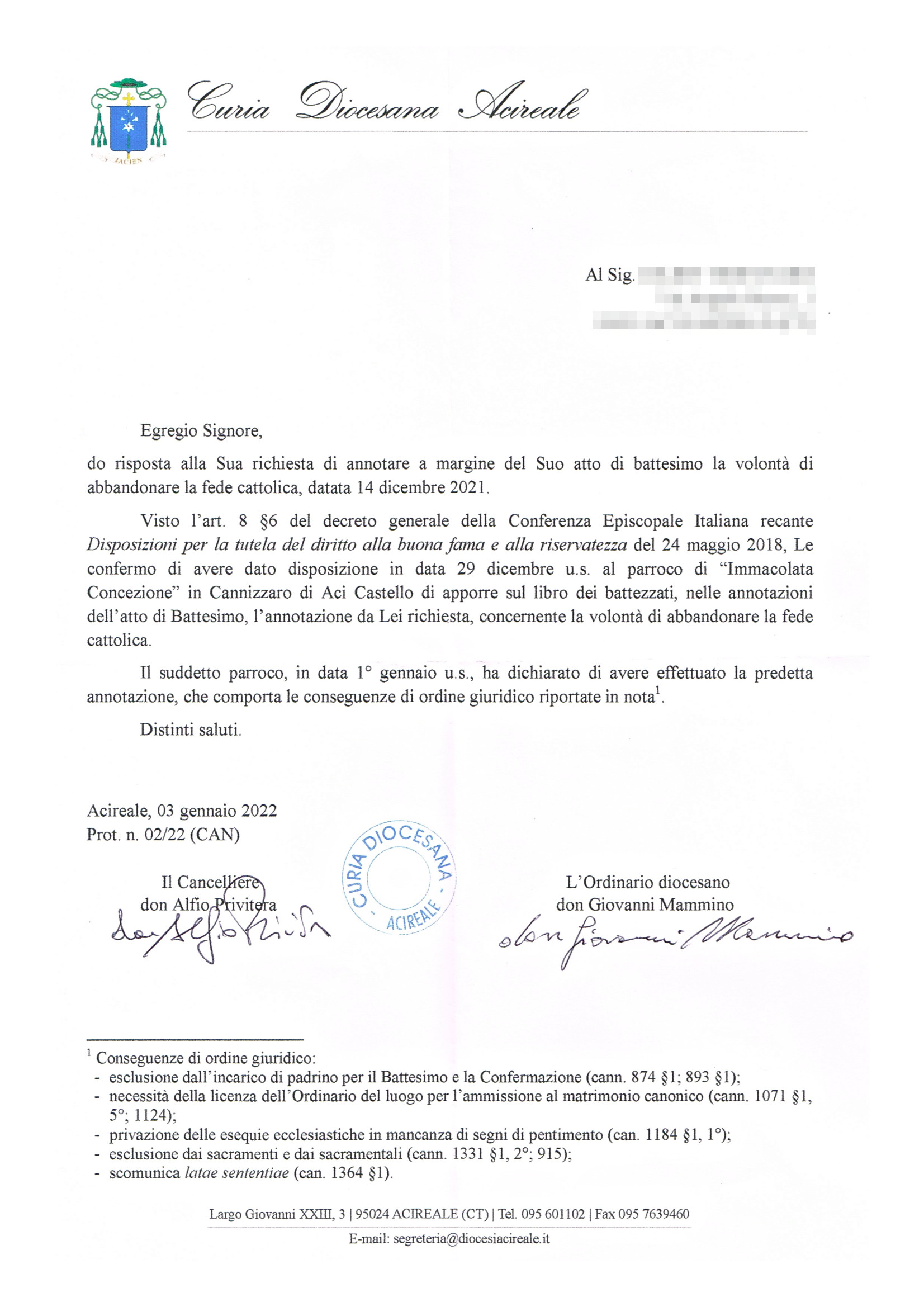 Una persona ha chiesto la rettifica dei dati relativi al proprio battesimo avvenuto a Immacolata Concezione - ACI CASTELLO (CT) il 03/01/2022, dichiarando di non voler più far parte della Chiesa Cattolica.