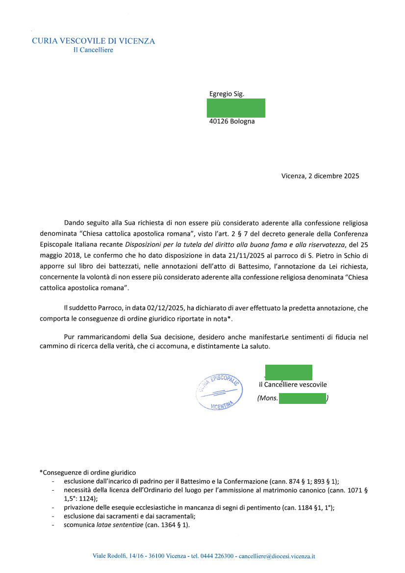 Una persona ha chiesto la rettifica dei dati relativi al proprio battesimo avvenuto a S. Pietro Apostolo - SCHIO (VI) il 02/12/2025, dichiarando di non voler più far parte della Chiesa Cattolica.