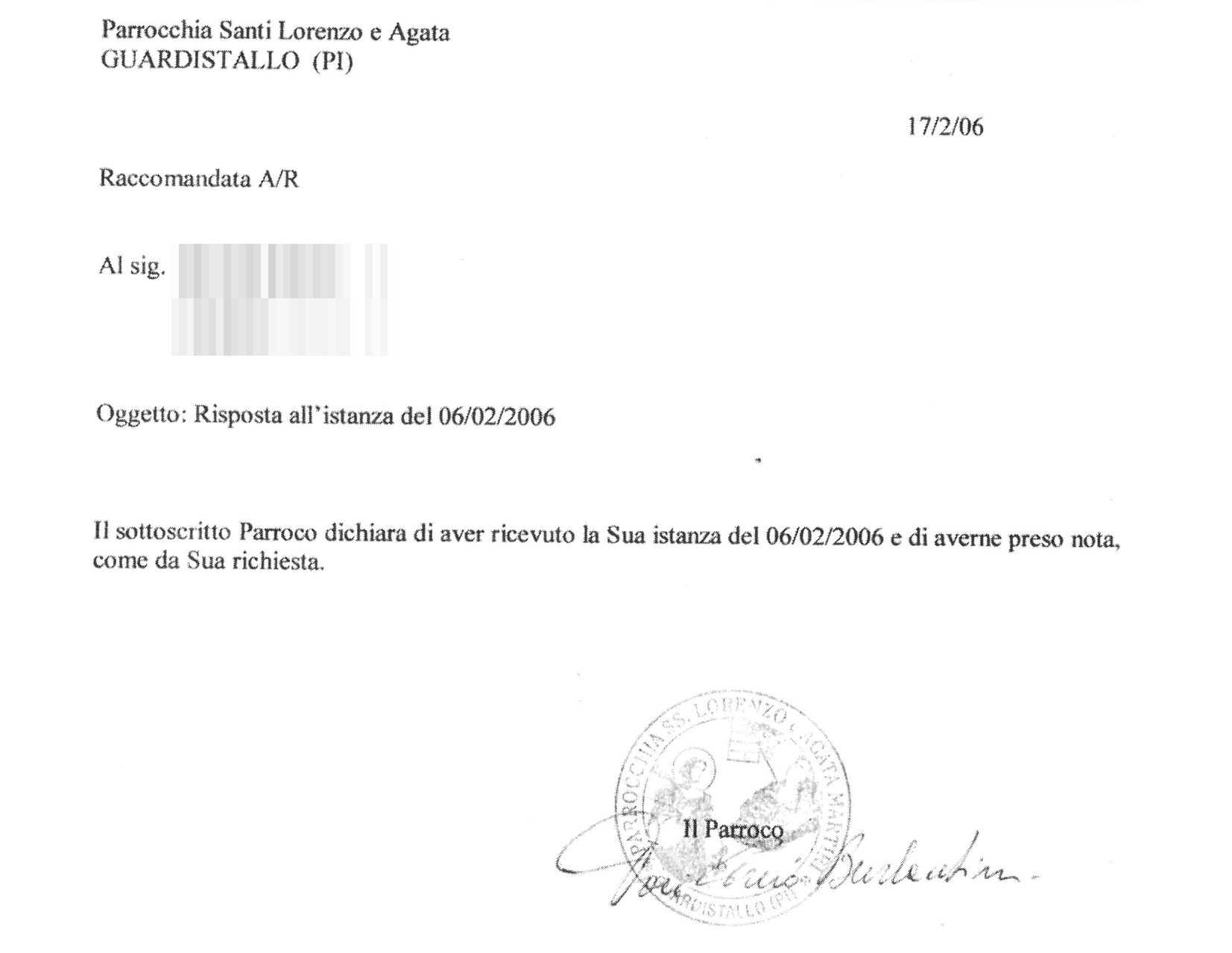 Una persona ha chiesto la rettifica dei dati relativi al proprio battesimo avvenuto a Santi Lorenzo Ed Agata - GUARDISTALLO (PI) il 07/02/2006, dichiarando di non voler più far parte della Chiesa Cattolica.