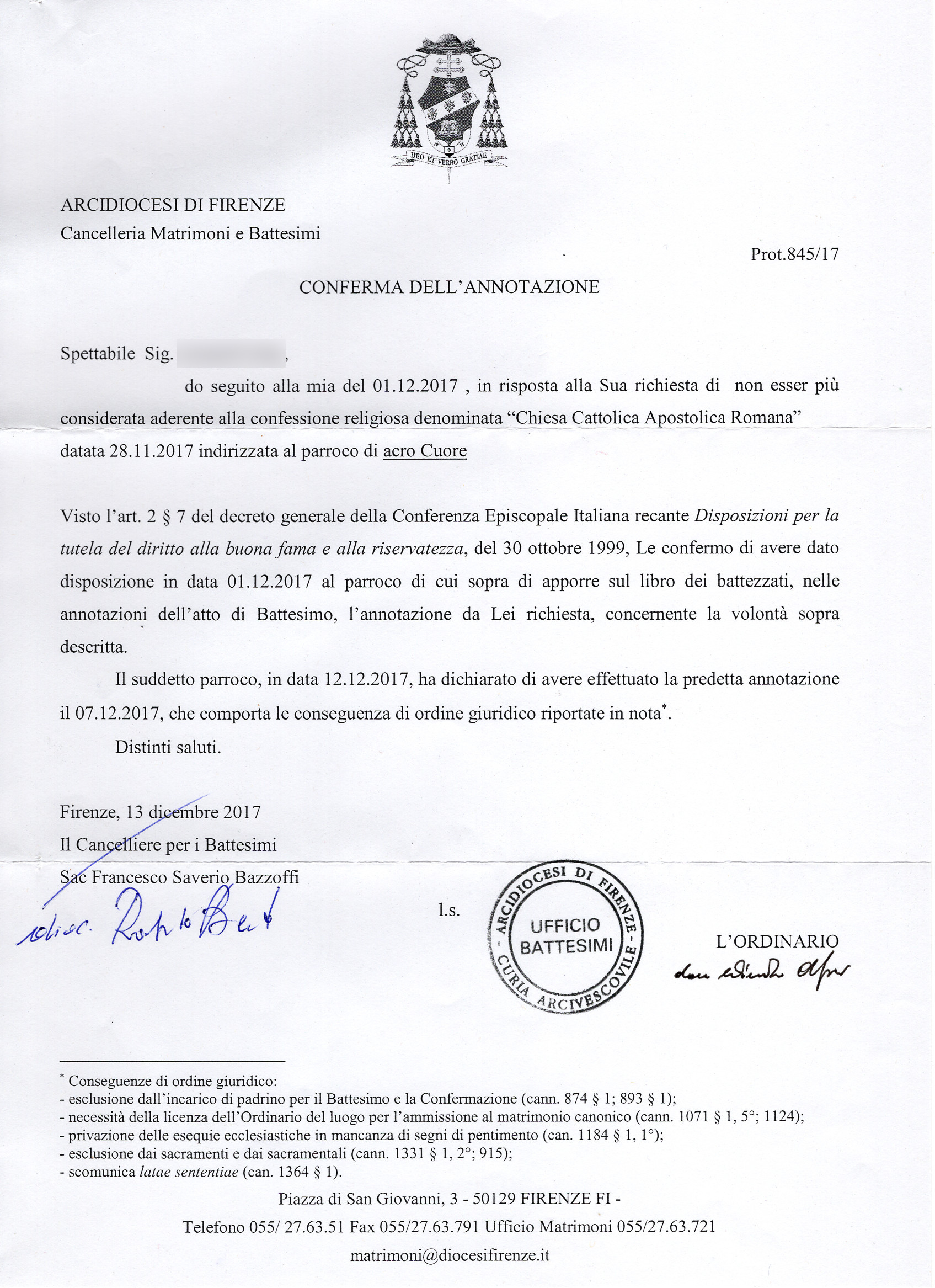 Una persona ha chiesto la rettifica dei dati relativi al proprio battesimo avvenuto a Sacro Cuore a Firenze - FIRENZE (FI) il 12/12/2017, dichiarando di non voler più far parte della Chiesa Cattolica.