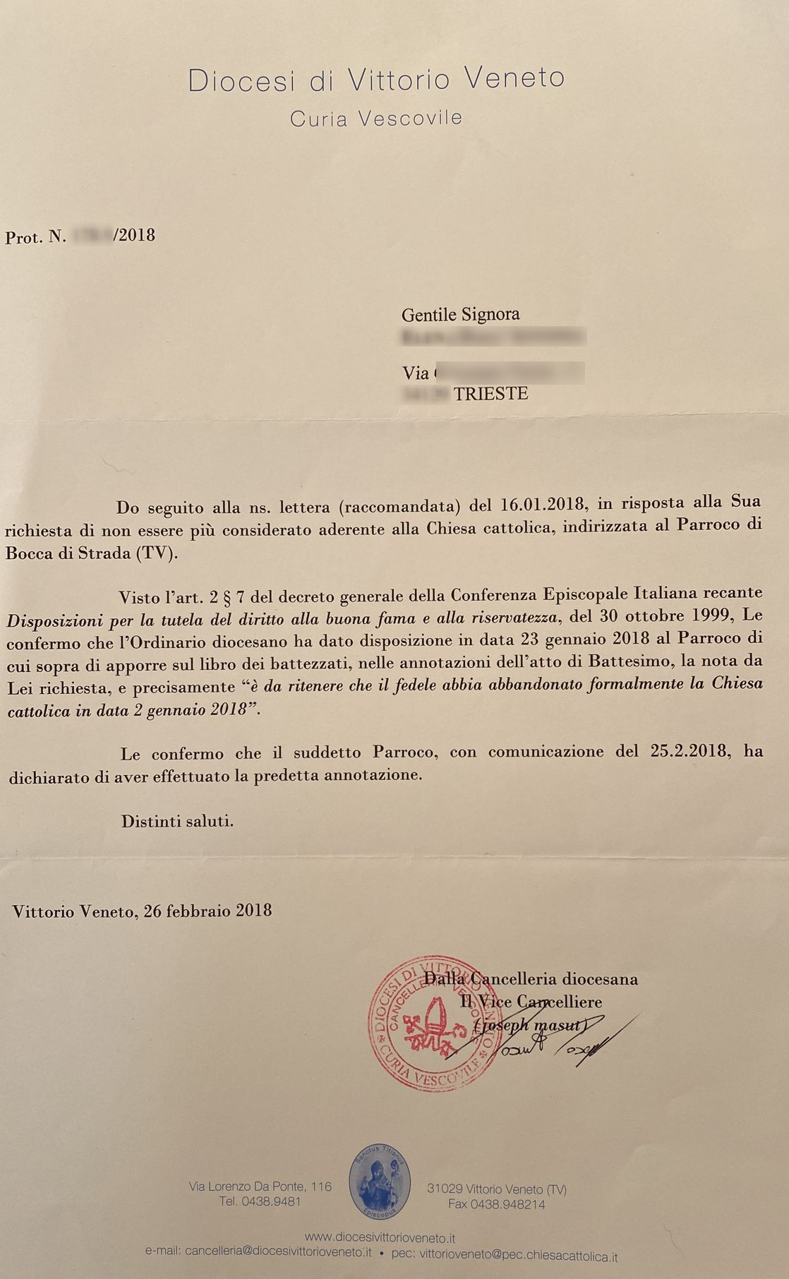 Una persona ha chiesto la rettifica dei dati relativi al proprio battesimo avvenuto a Presentazione di Maria Ss. - MARENO DI PIAVE (TV) il 25/02/2018, dichiarando di non voler più far parte della Chiesa Cattolica.