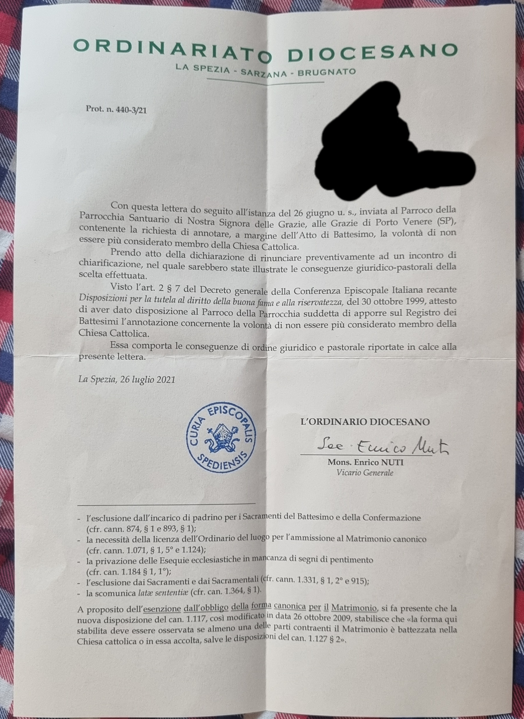 Una persona ha chiesto la rettifica dei dati relativi al proprio battesimo avvenuto a Nostra Signora delle Grazie - PORTOVENERE (SP) il 26/07/2021, dichiarando di non voler più far parte della Chiesa Cattolica.