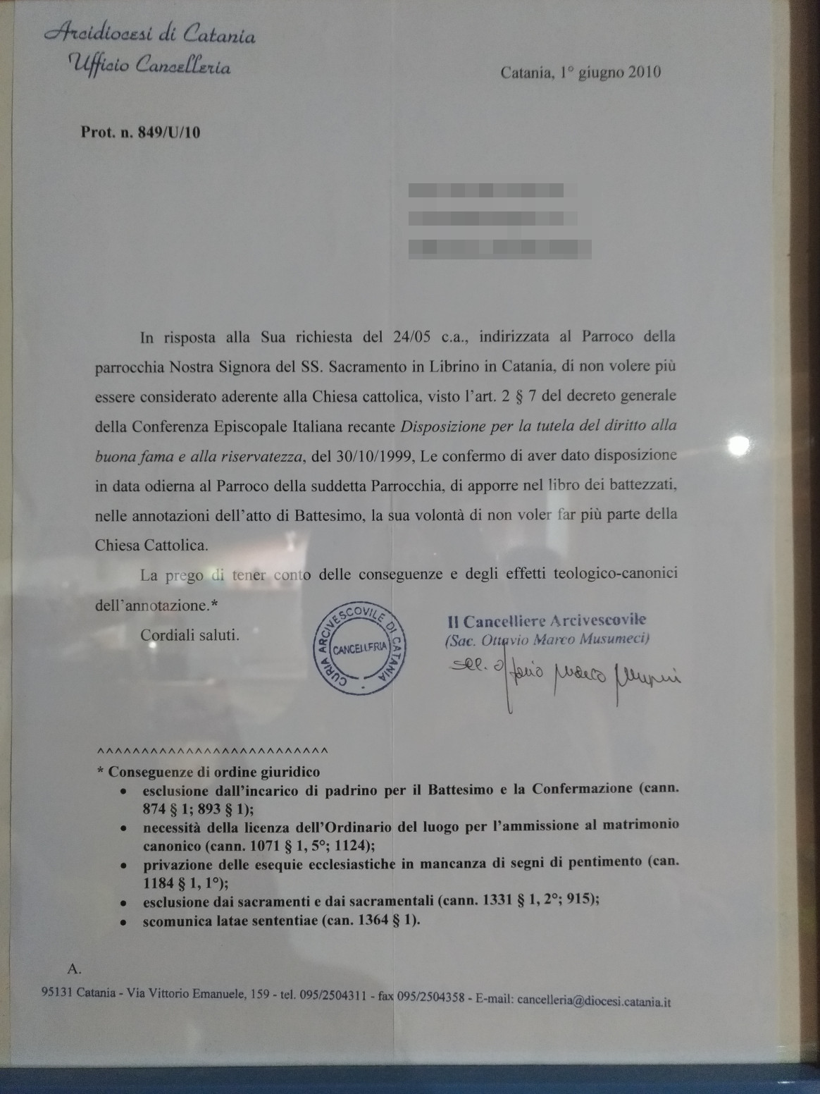 Una persona ha chiesto la rettifica dei dati relativi al proprio battesimo avvenuto a Nostra Signora del Ss. Sacramento in Librino - CATANIA (CT) il 01/06/2010, dichiarando di non voler più far parte della Chiesa Cattolica.
