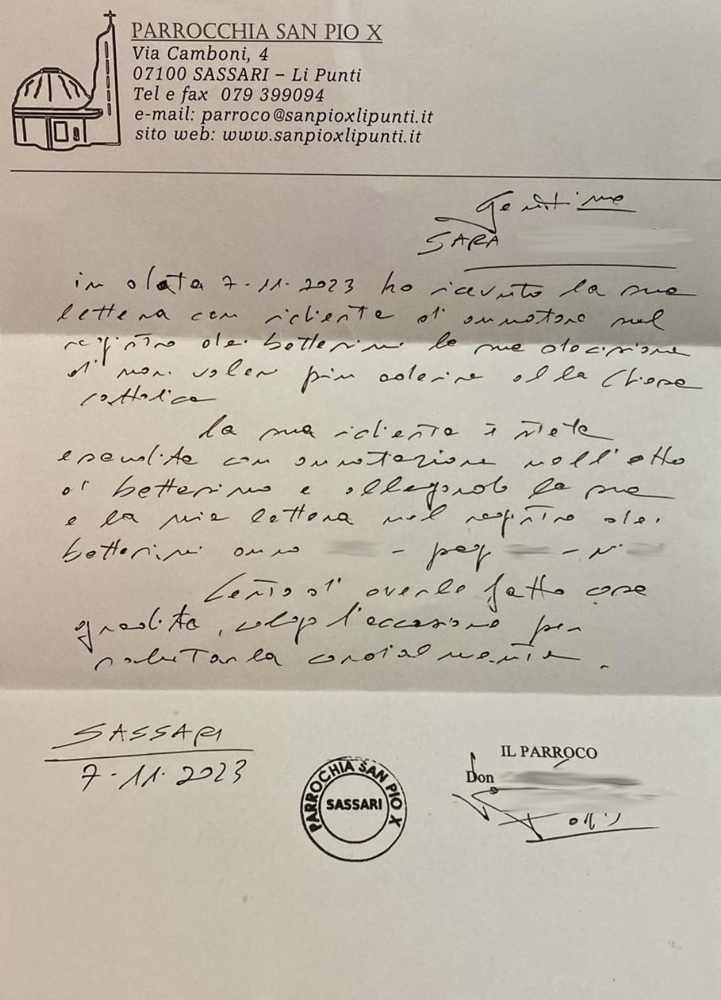 Una persona ha chiesto la rettifica dei dati relativi al proprio battesimo avvenuto a S. Pio X - SASSARI (SS) il 07/11/2023, dichiarando di non voler più far parte della Chiesa Cattolica.