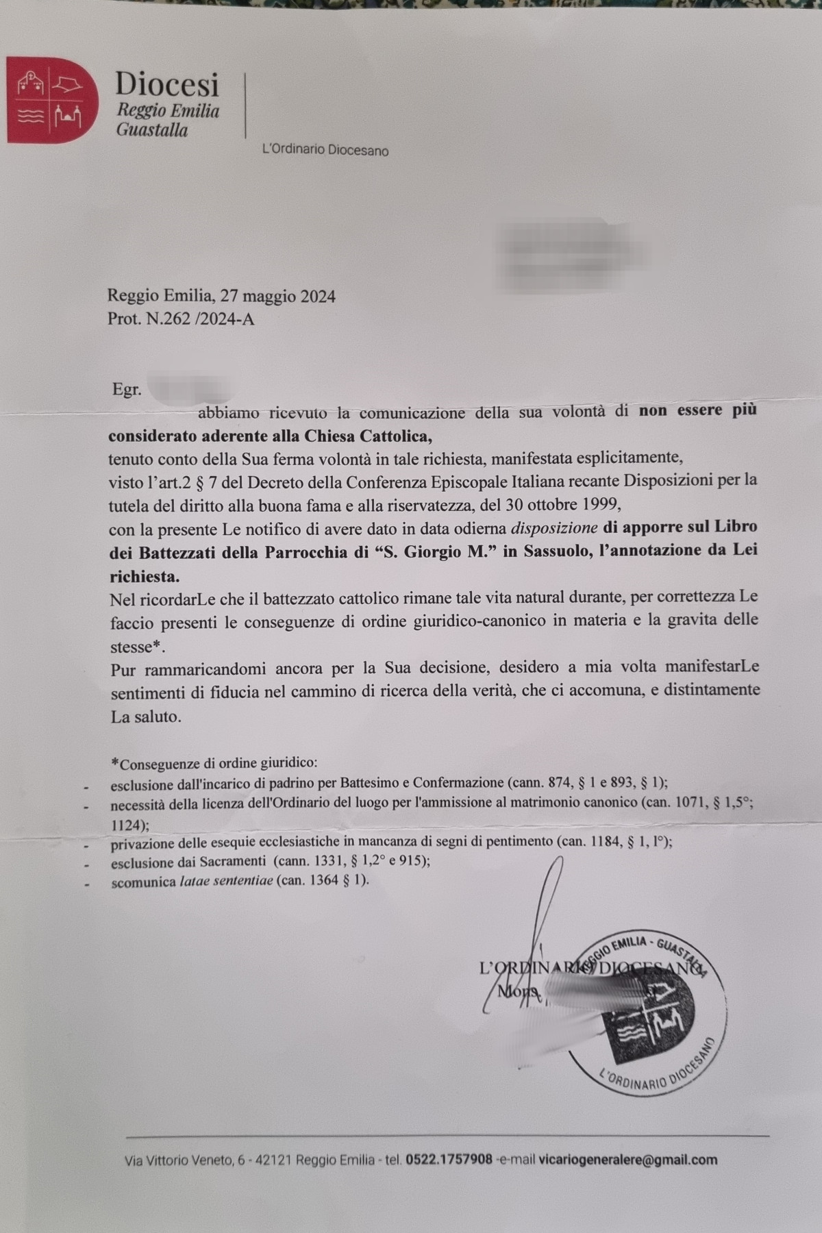 Una persona ha chiesto la rettifica dei dati relativi al proprio battesimo avvenuto a S. Giorgio M. - SASSUOLO (MO) il 27/05/2024, dichiarando di non voler più far parte della Chiesa Cattolica.