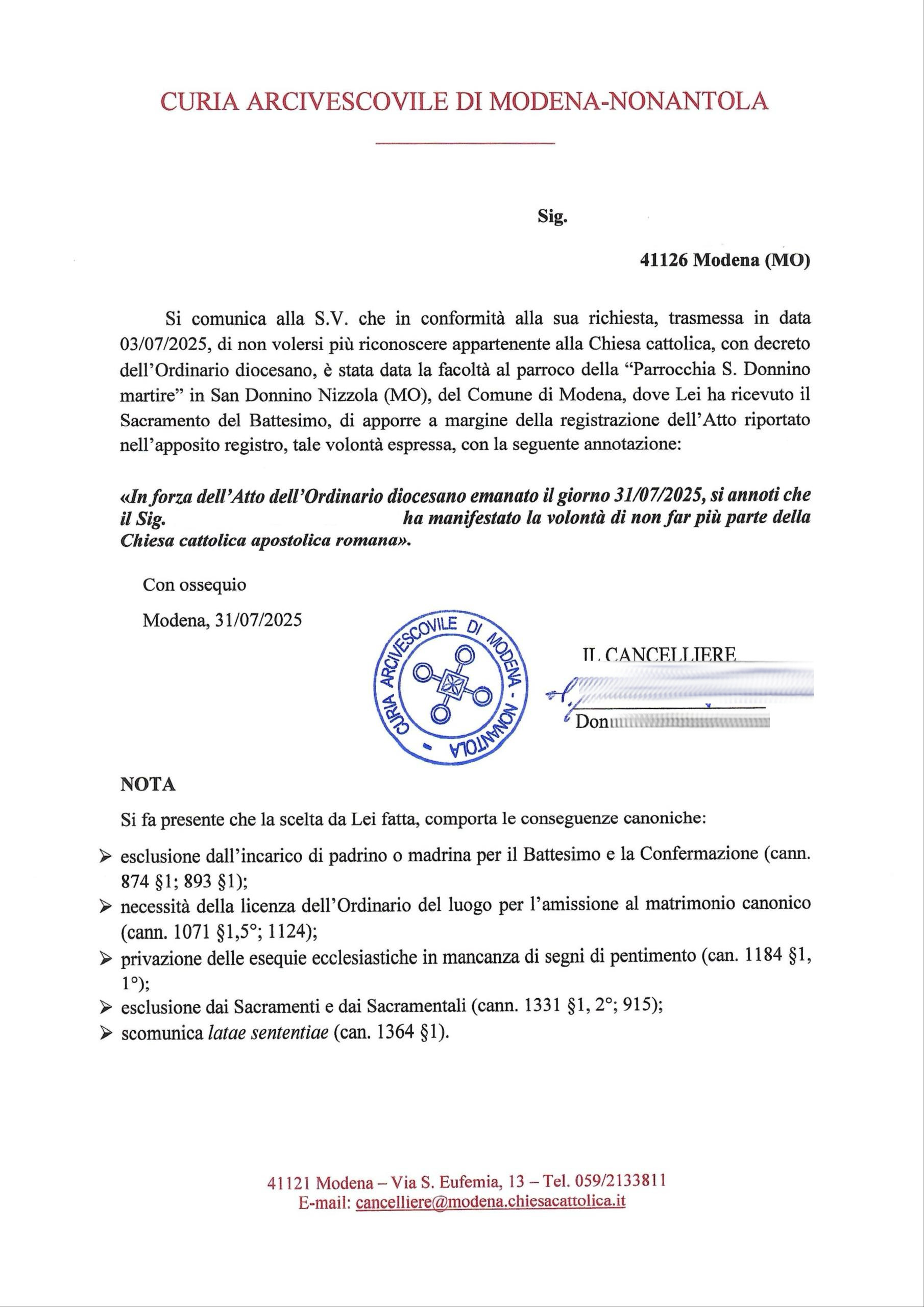 Una persona ha chiesto la rettifica dei dati relativi al proprio battesimo avvenuto a S. Donnino Martire - MODENA (MO) il 04/08/2025, dichiarando di non voler più far parte della Chiesa Cattolica.