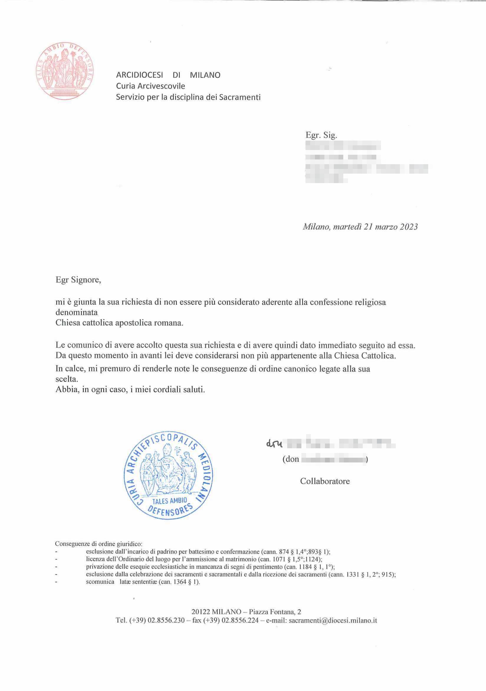 Una persona ha chiesto la rettifica dei dati relativi al proprio battesimo avvenuto a Santi Martiri Evasio e Stefano - VARESE (VA) il 02/03/2023, dichiarando di non voler più far parte della Chiesa Cattolica.