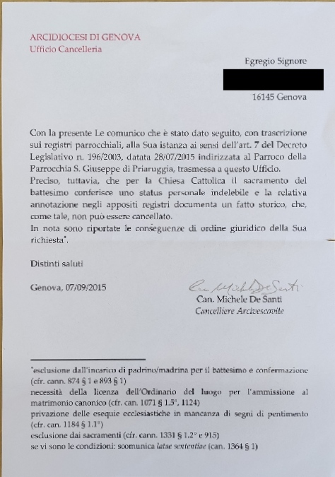 Una persona ha chiesto la rettifica dei dati relativi al proprio battesimo avvenuto a S. Giuseppe di Priaruggia - GENOVA (GE) il 07/09/2015, dichiarando di non voler più far parte della Chiesa Cattolica.