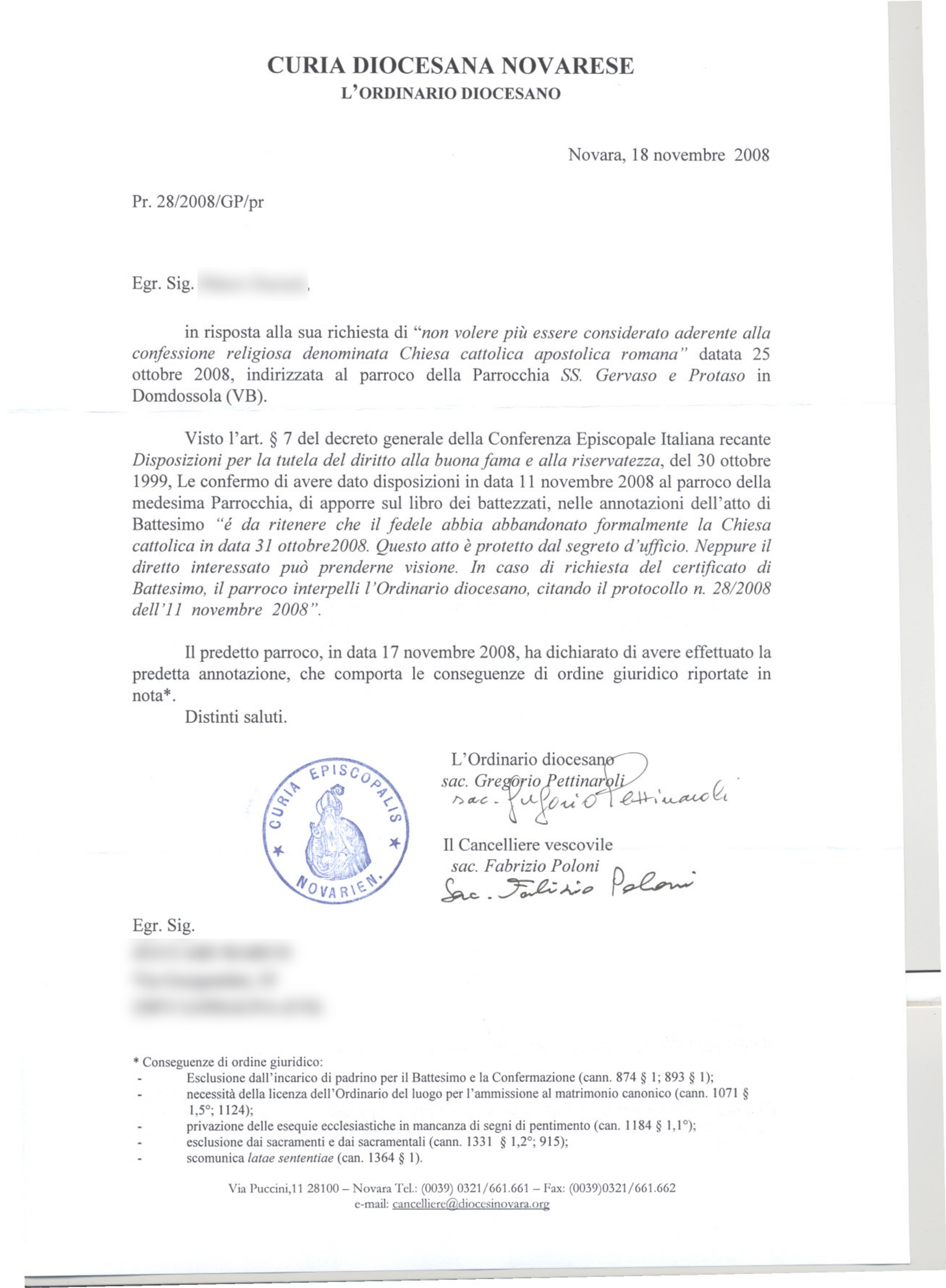 Una persona ha chiesto la rettifica dei dati relativi al proprio battesimo avvenuto a Santi Gervaso e Protaso - DOMODOSSOLA (VB) il 18/11/2008, dichiarando di non voler più far parte della Chiesa Cattolica.