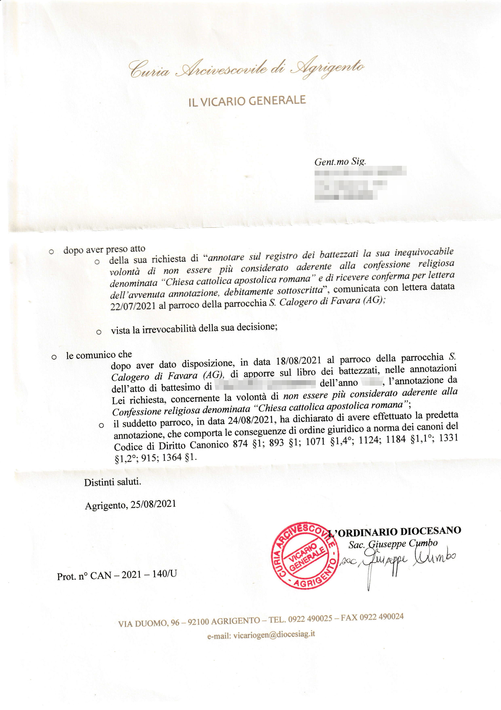 Una persona ha chiesto la rettifica dei dati relativi al proprio battesimo avvenuto a S. Calogero - FAVARA (AG) il 01/09/2021, dichiarando di non voler più far parte della Chiesa Cattolica.