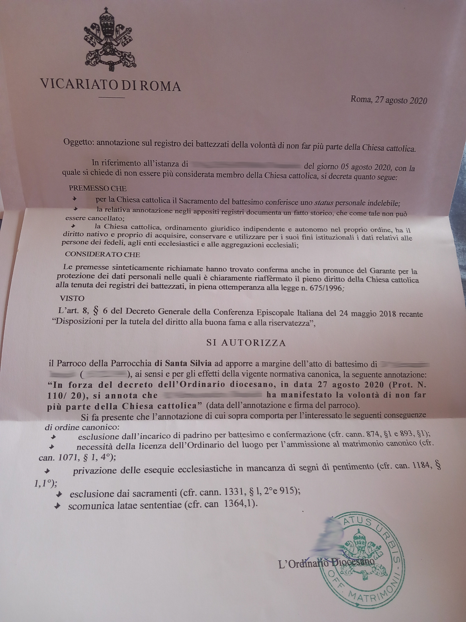 Una persona ha chiesto la rettifica dei dati relativi al proprio battesimo avvenuto a S. Silvia - ROMA (RM) il 27/08/2020, dichiarando di non voler più far parte della Chiesa Cattolica.