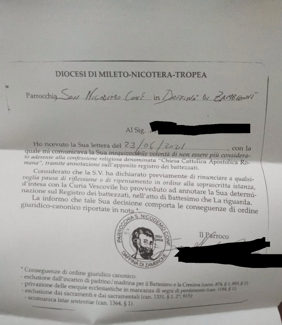 Una persona ha chiesto la rettifica dei dati relativi al proprio battesimo avvenuto a S. Nicodemo Confessore - ZAMBRONE (VV) il 06/08/2021, dichiarando di non voler più far parte della Chiesa Cattolica.
