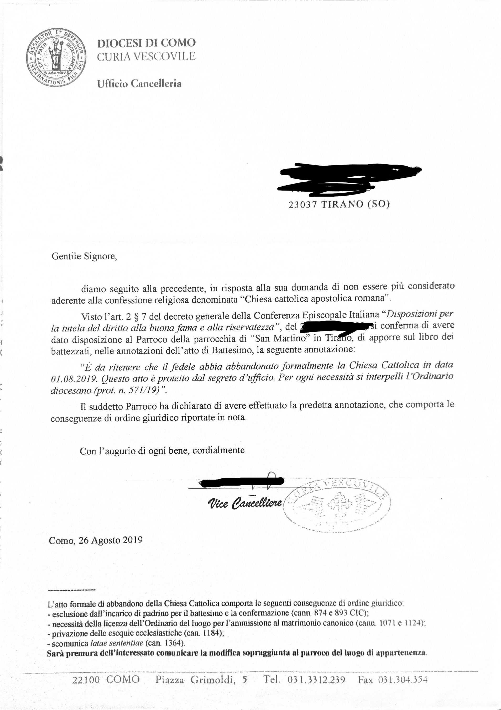 Una persona ha chiesto la rettifica dei dati relativi al proprio battesimo avvenuto a S. Martino - TIRANO (SO) il 01/08/2019, dichiarando di non voler più far parte della Chiesa Cattolica.
