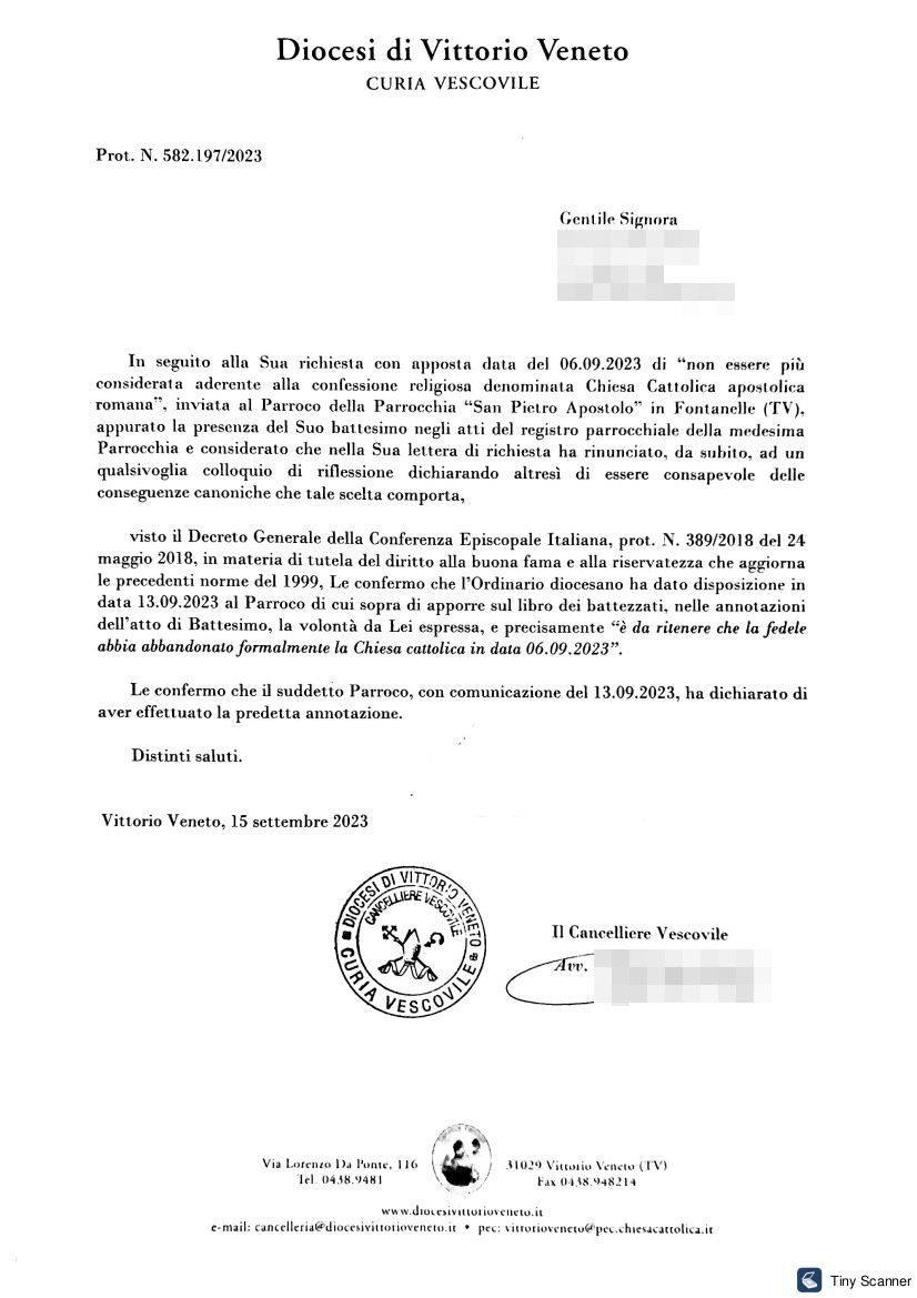 Una persona ha chiesto la rettifica dei dati relativi al proprio battesimo avvenuto a Natività di Maria - FONTANELLE (TV) il 22/09/2023, dichiarando di non voler più far parte della Chiesa Cattolica.