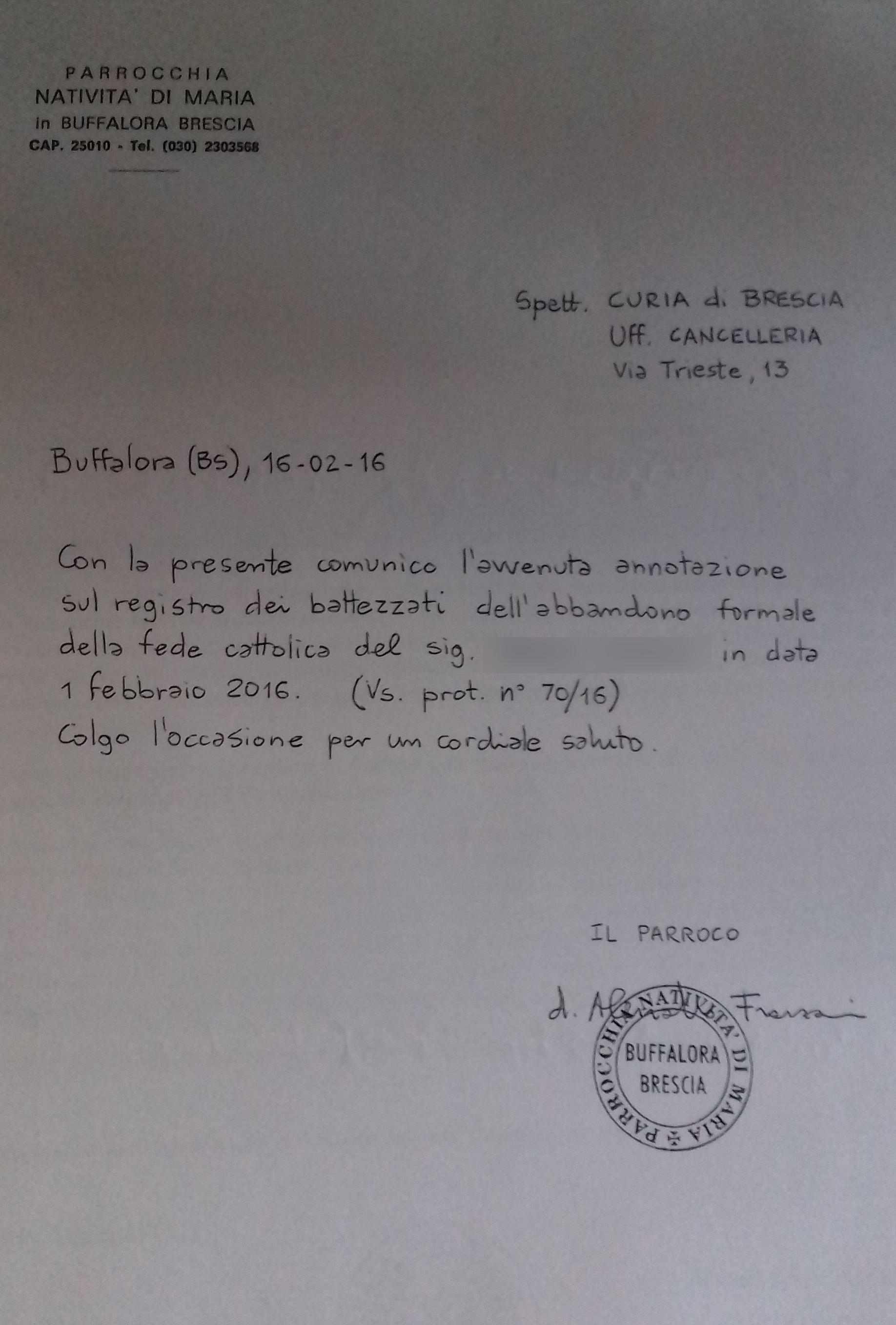 Una persona ha chiesto la rettifica dei dati relativi al proprio battesimo avvenuto a Natività di Maria - BRESCIA (BS) il 16/02/2016, dichiarando di non voler più far parte della Chiesa Cattolica.