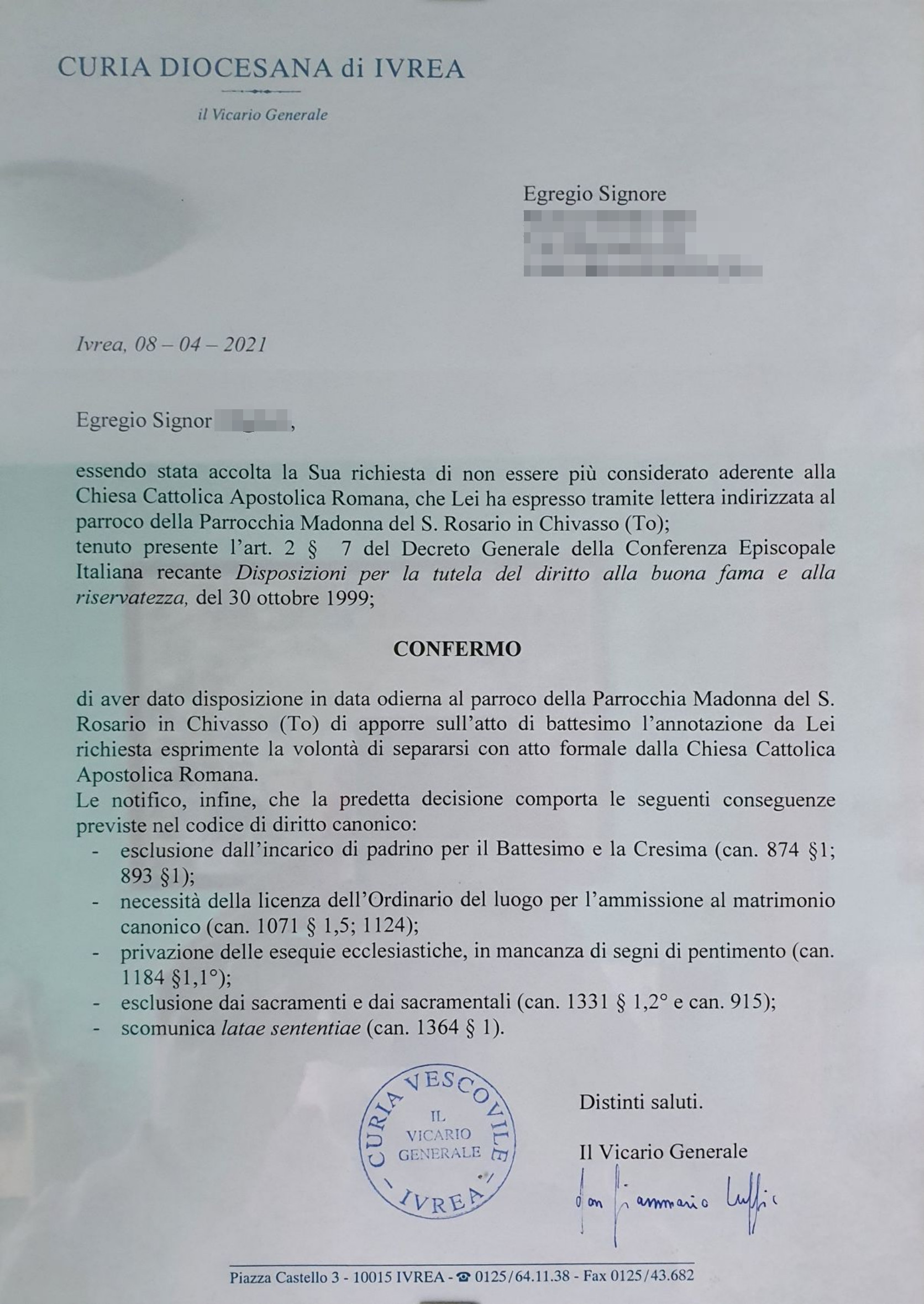 Una persona ha chiesto la rettifica dei dati relativi al proprio battesimo avvenuto a Madonna del S. Rosario - CHIVASSO (TO) il 08/04/2021, dichiarando di non voler più far parte della Chiesa Cattolica.