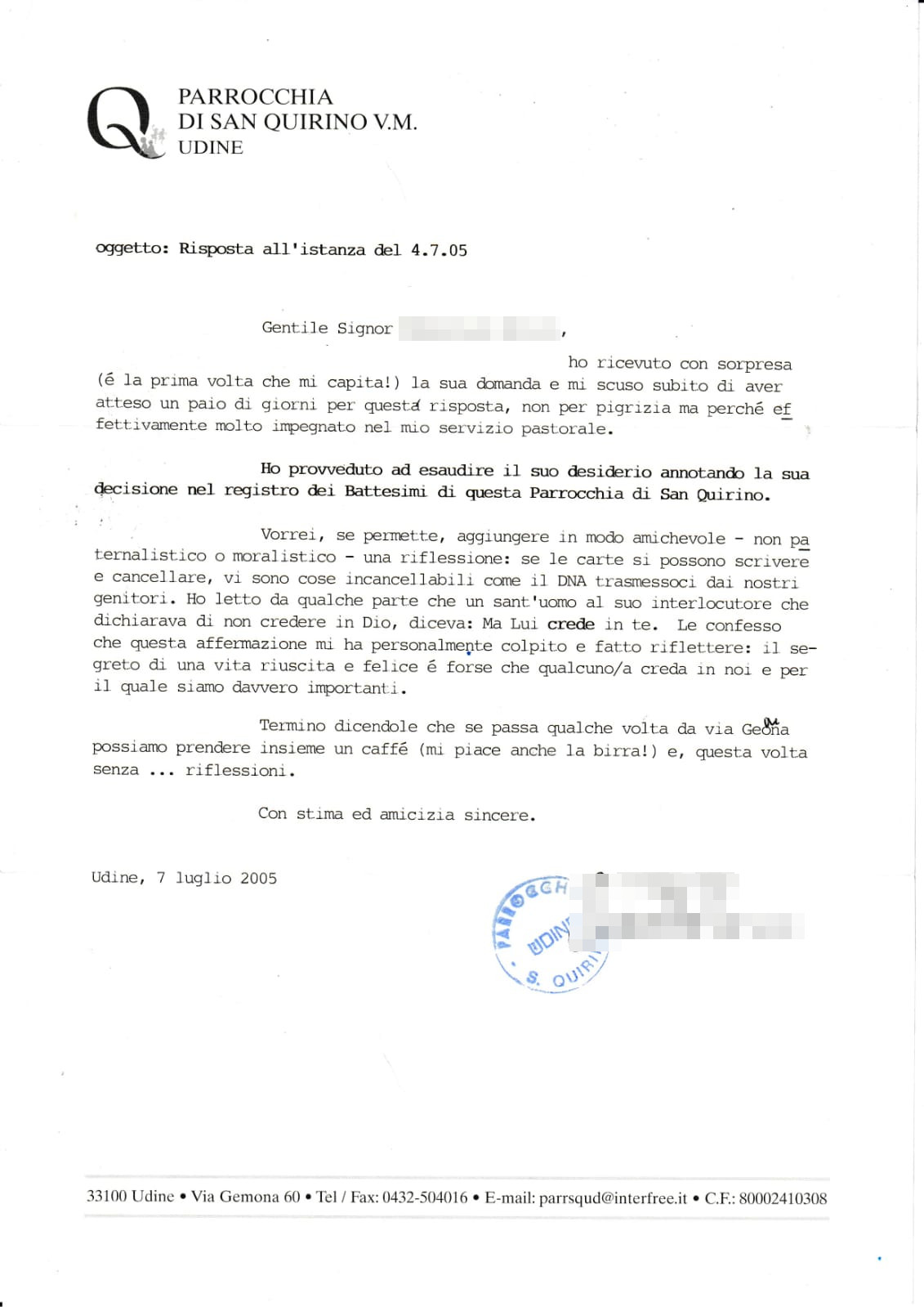 Una persona ha chiesto la rettifica dei dati relativi al proprio battesimo avvenuto a S. Quirino Vescovo e Martire - UDINE (UD) il 07/07/2005, dichiarando di non voler più far parte della Chiesa Cattolica.