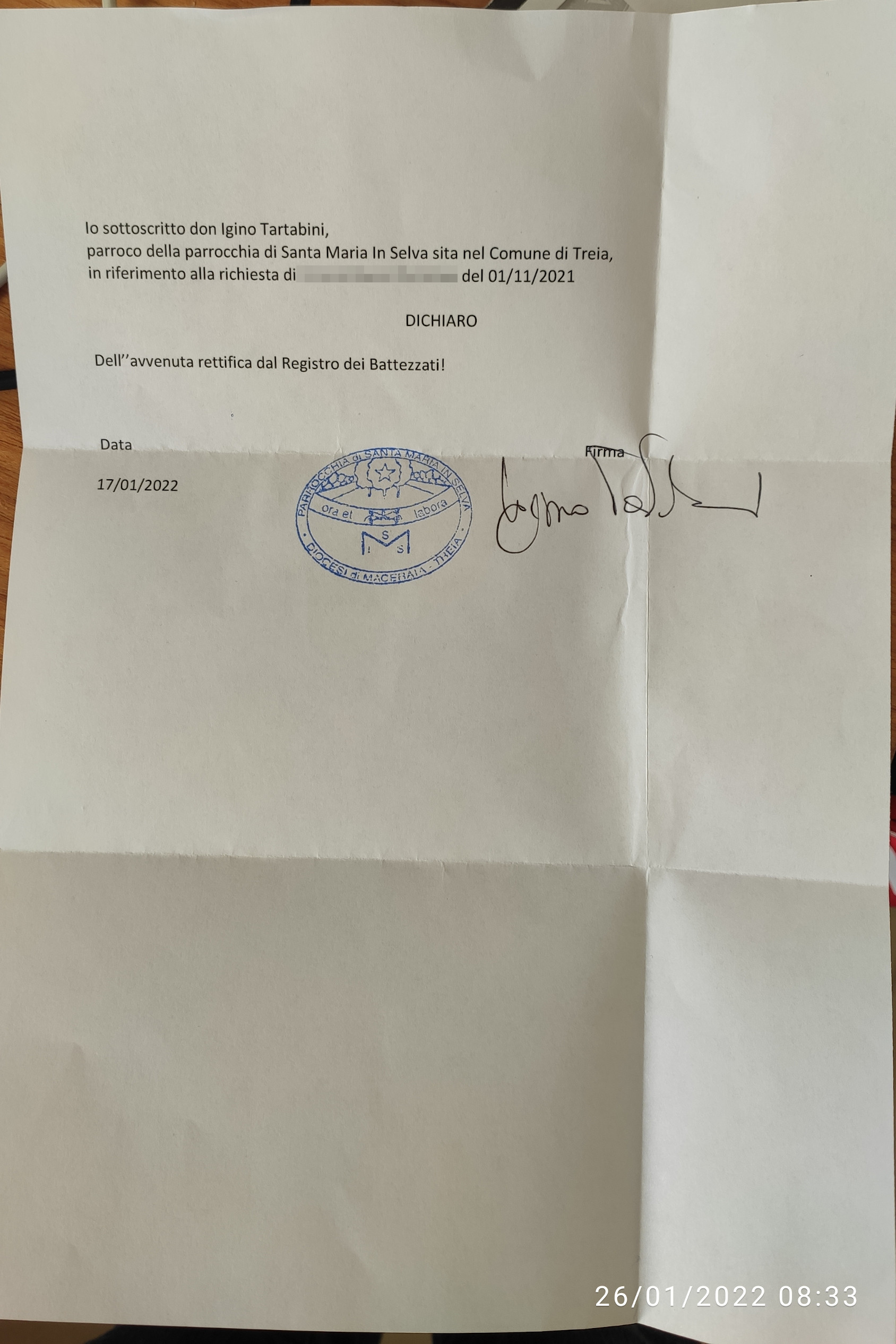 Una persona ha chiesto la rettifica dei dati relativi al proprio battesimo avvenuto a S. Maria in Selva - TREIA (MC) il 17/01/2022, dichiarando di non voler più far parte della Chiesa Cattolica.