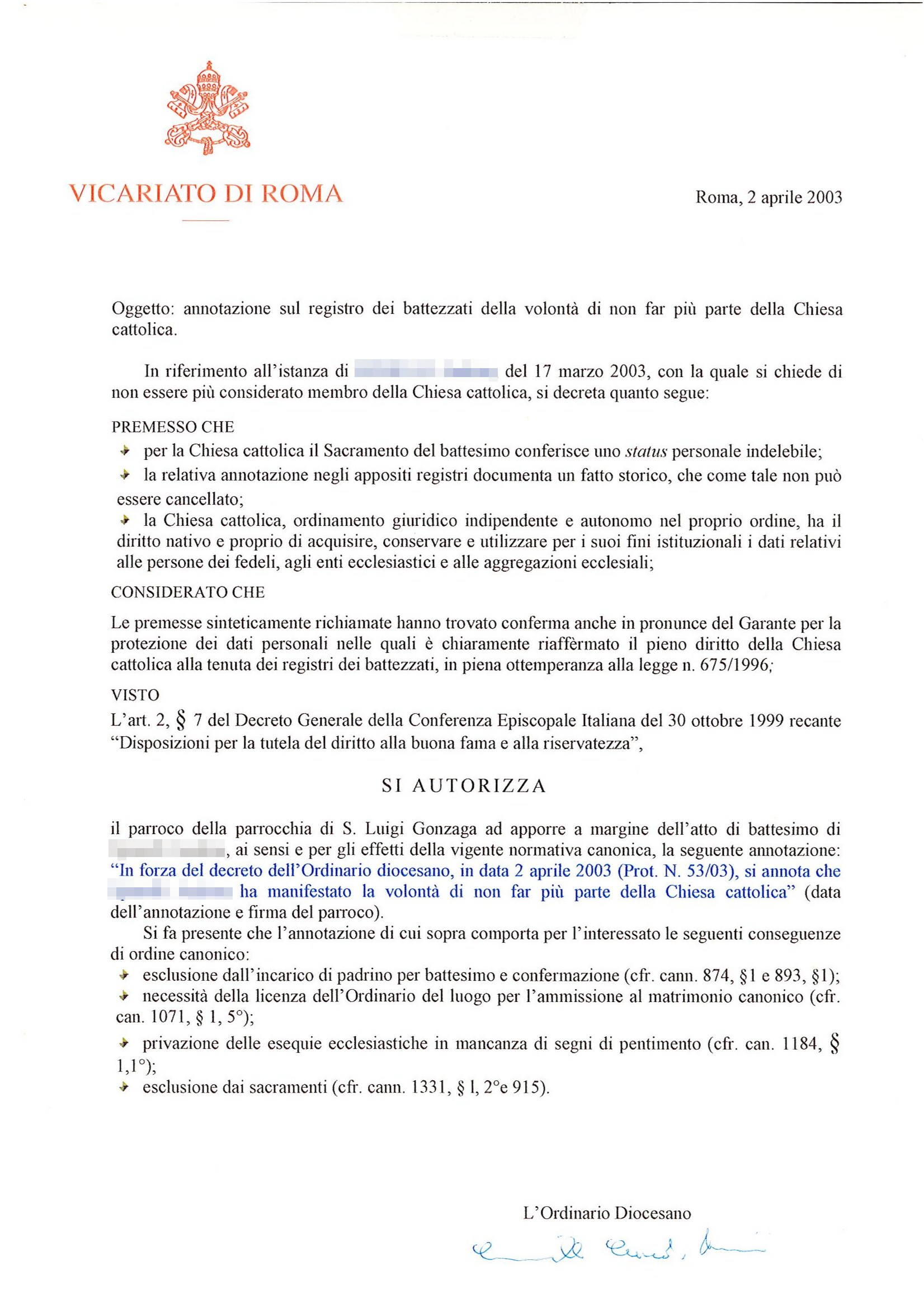 Una persona ha chiesto la rettifica dei dati relativi al proprio battesimo avvenuto a Preziosissimo Sangue di Nostro Signore Gesù Cristo - ROMA (RM) il 02/04/2003, dichiarando di non voler più far parte della Chiesa Cattolica.