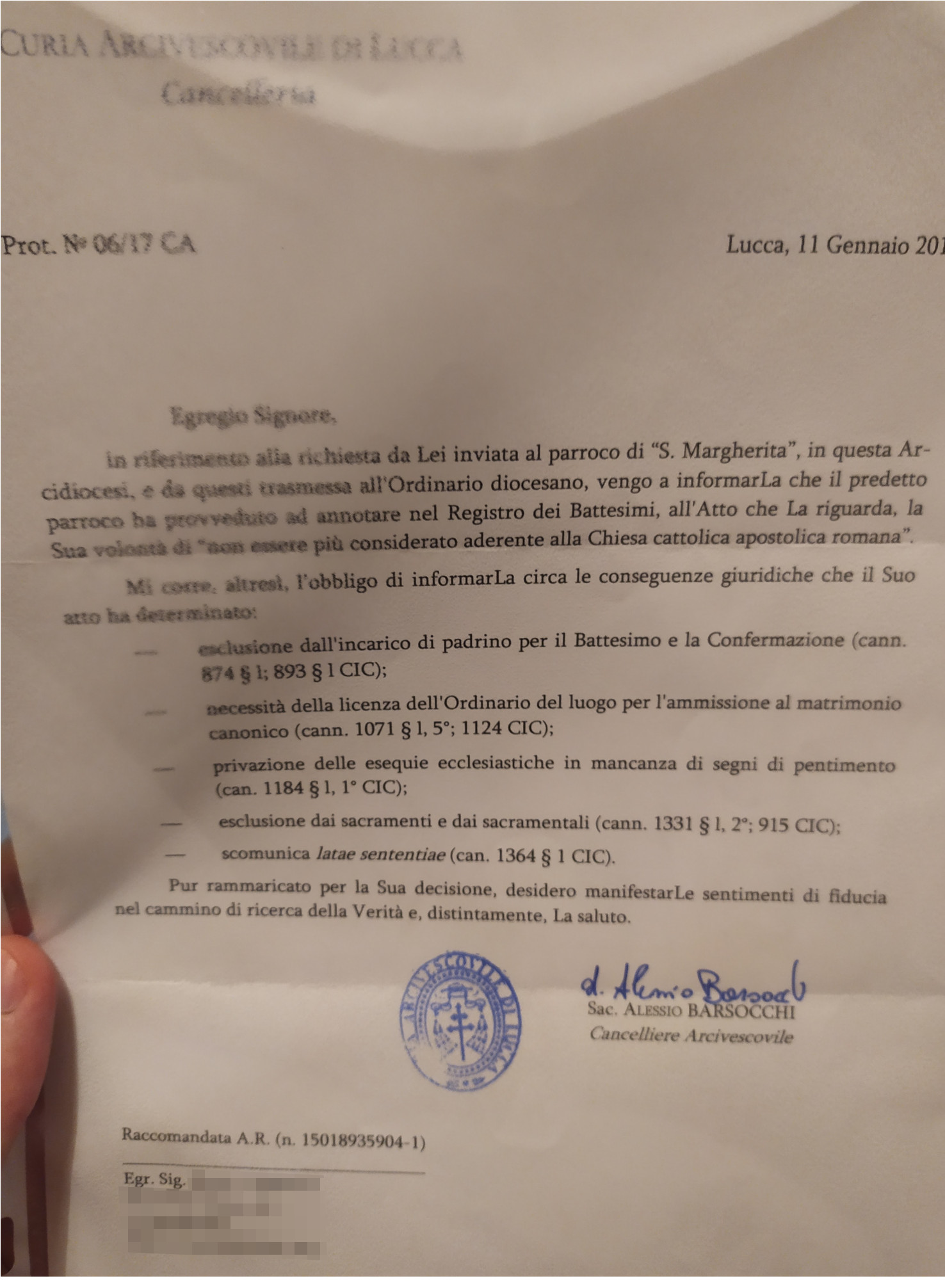 Una persona ha chiesto la rettifica dei dati relativi al proprio battesimo avvenuto a S. Margherita - CAPANNORI (LU) il 11/01/2017, dichiarando di non voler più far parte della Chiesa Cattolica.