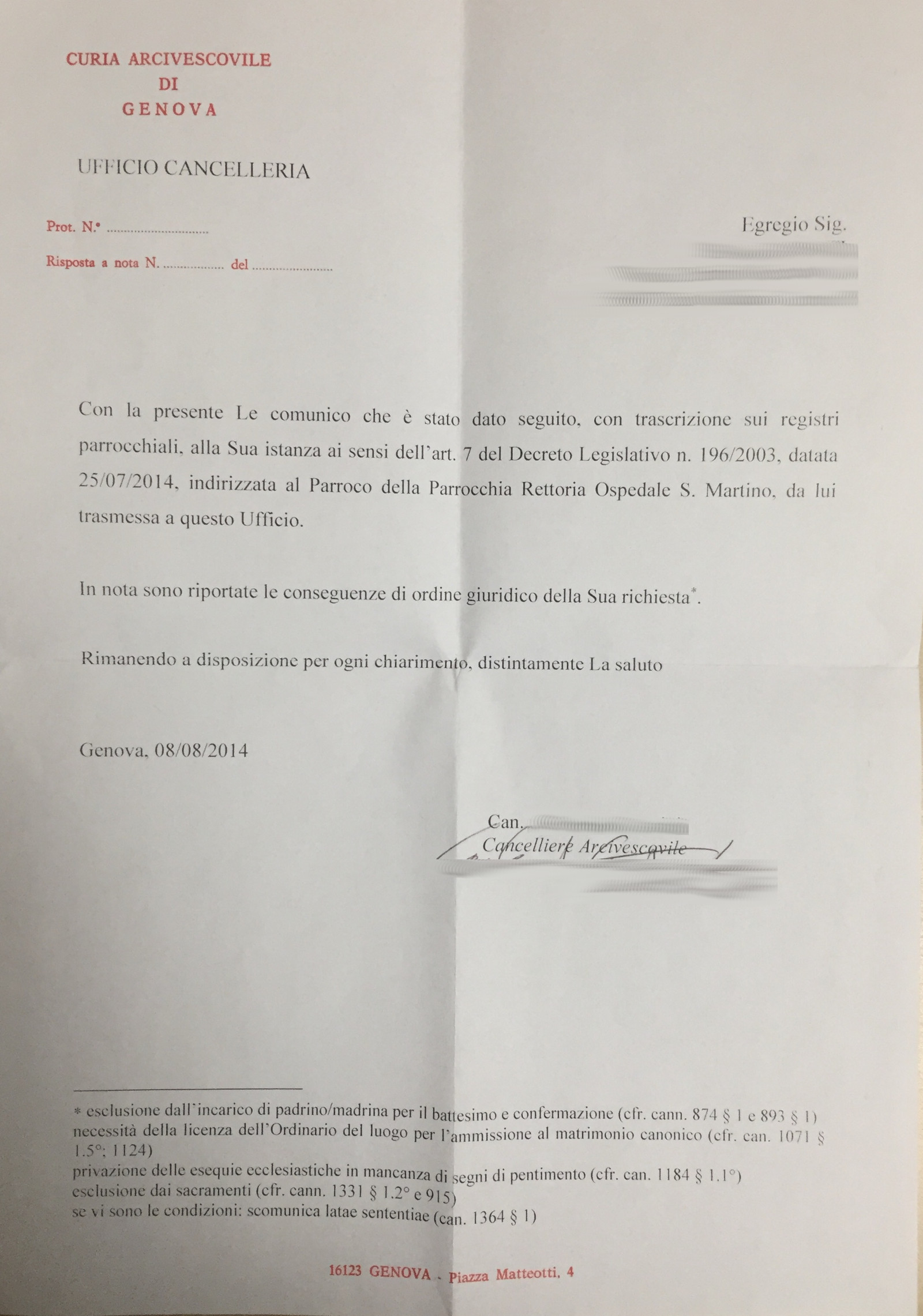 Una persona ha chiesto la rettifica dei dati relativi al proprio battesimo avvenuto a Parrocchia Rettoria Ospedale San Martino - GENOVA (GE) il 08/08/2014, dichiarando di non voler più far parte della Chiesa Cattolica.