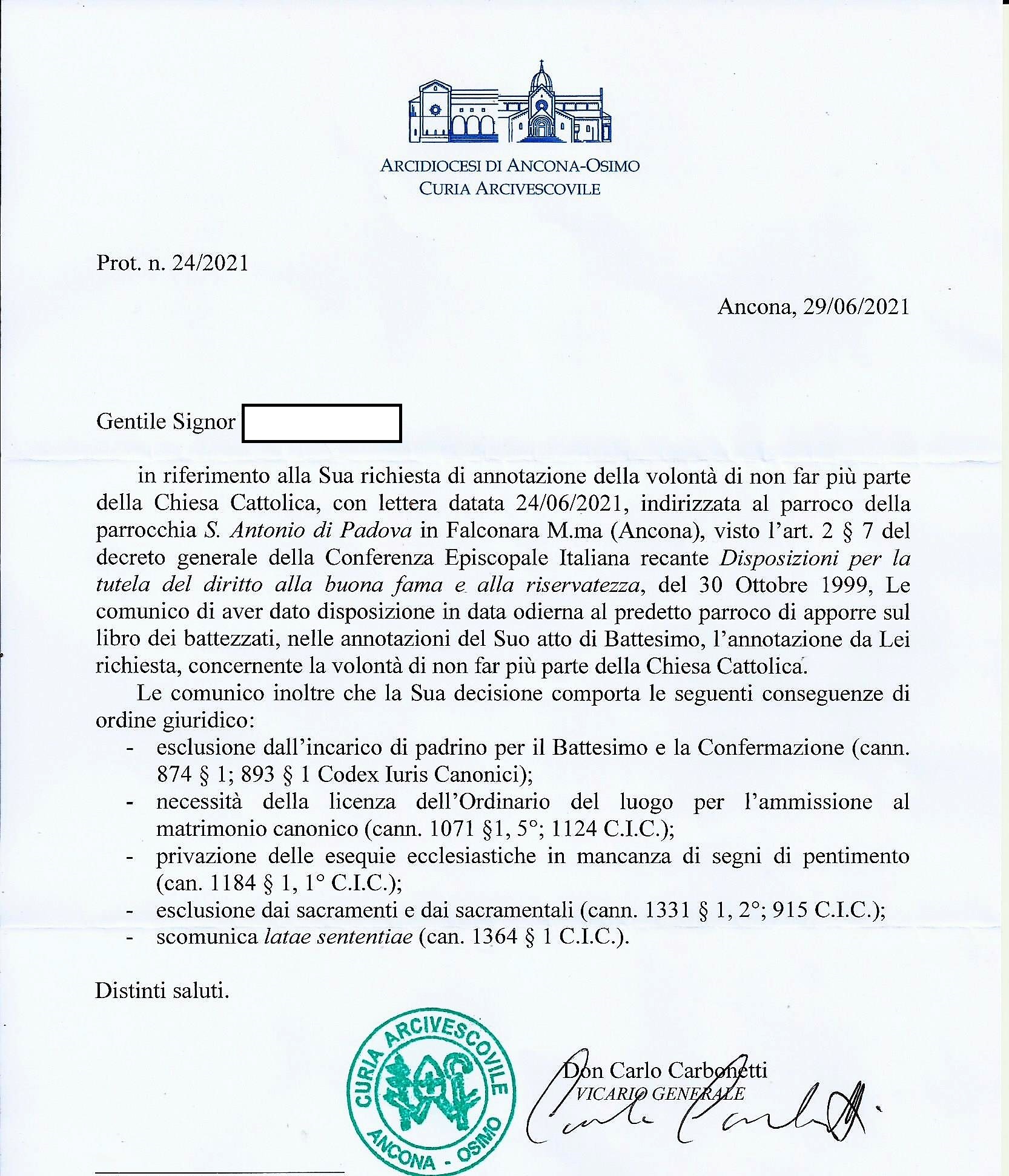 Una persona ha chiesto la rettifica dei dati relativi al proprio battesimo avvenuto a S. Antonio di Padova - FALCONARA MARITTIMA (AN) il 29/06/2021, dichiarando di non voler più far parte della Chiesa Cattolica.