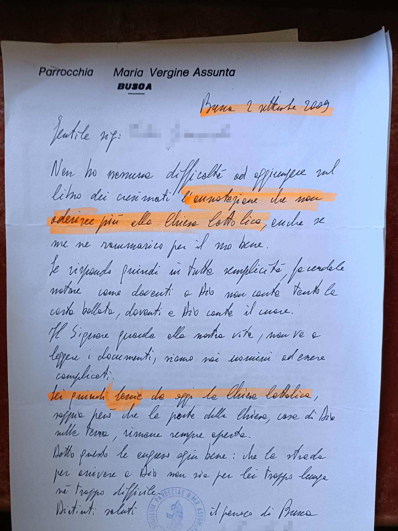 Una persona ha chiesto la rettifica dei dati relativi al proprio battesimo avvenuto a Natività di Maria Vergine Ss.ma - BUSCA (CN) il 02/09/2009, dichiarando di non voler più far parte della Chiesa Cattolica.