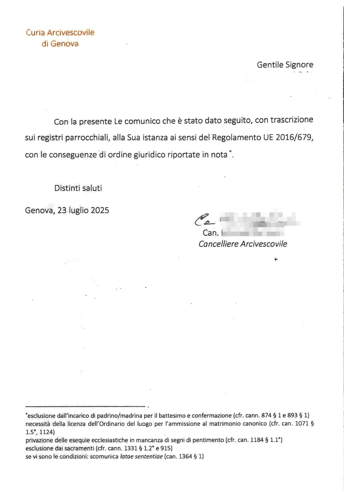 Una persona ha chiesto la rettifica dei dati relativi al proprio battesimo avvenuto a S. Cuore e S. Giacomo di Carignano - GENOVA (GE) il 23/07/2025, dichiarando di non voler più far parte della Chiesa Cattolica.