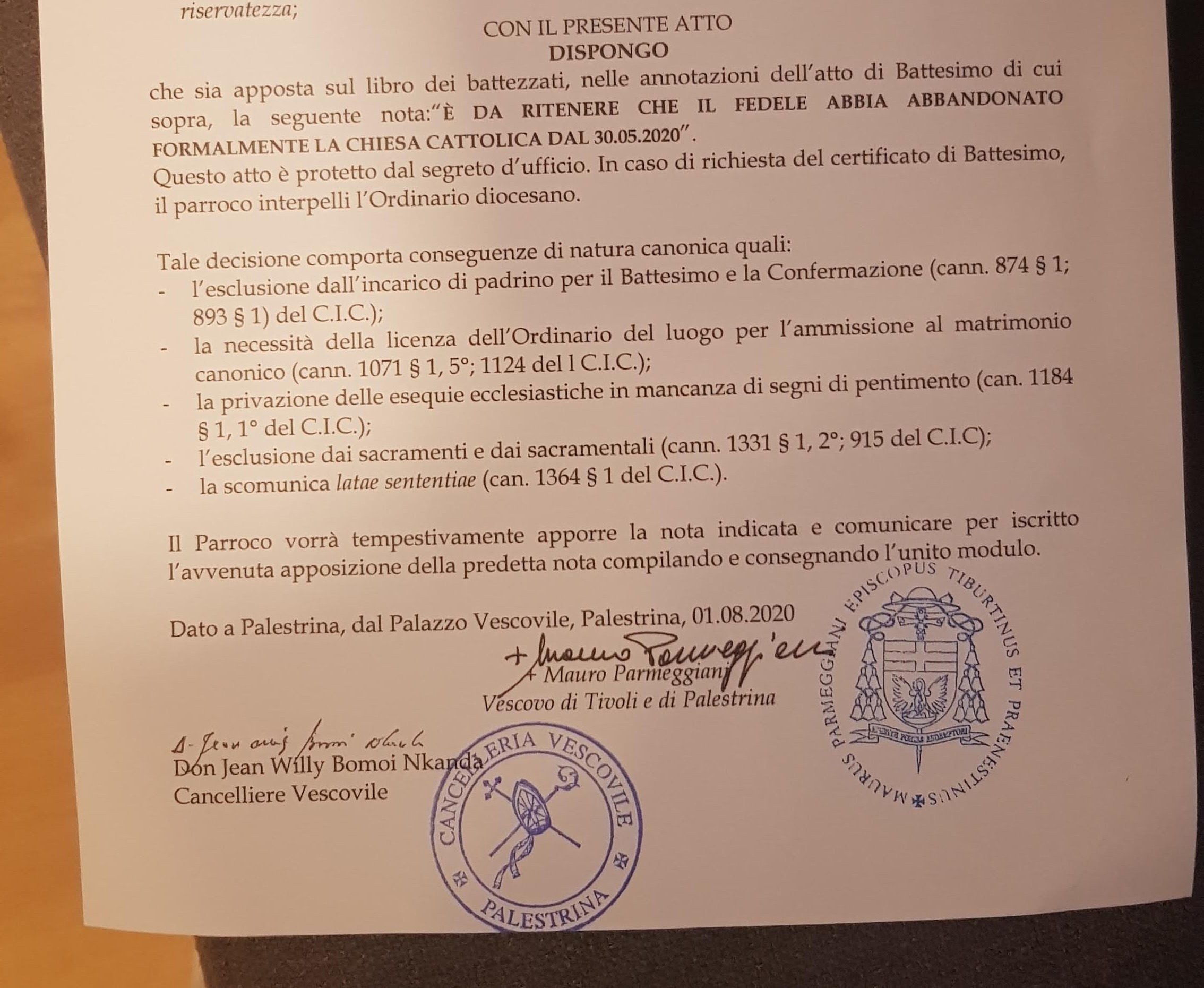Una persona ha chiesto la rettifica dei dati relativi al proprio battesimo avvenuto a S. Andrea Apostolo - LABICO (RM) il 30/05/2020, dichiarando di non voler più far parte della Chiesa Cattolica.