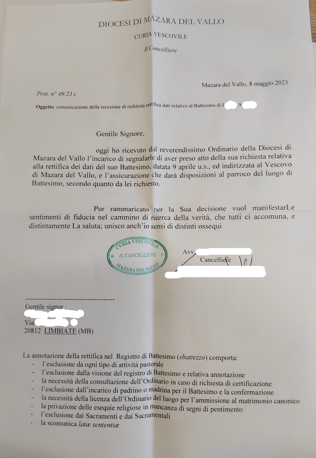 Una persona ha chiesto la rettifica dei dati relativi al proprio battesimo avvenuto a S. Rosalia Vergine - MAZARA DEL VALLO (TP) il 08/05/2023, dichiarando di non voler più far parte della Chiesa Cattolica.