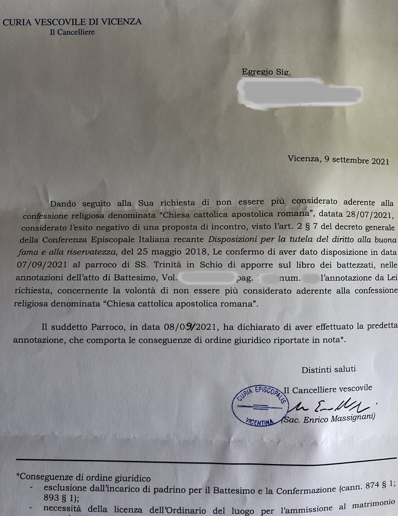 Una persona ha chiesto la rettifica dei dati relativi al proprio battesimo avvenuto a Ss. Trinità - SCHIO (VI) il 09/09/2021, dichiarando di non voler più far parte della Chiesa Cattolica.