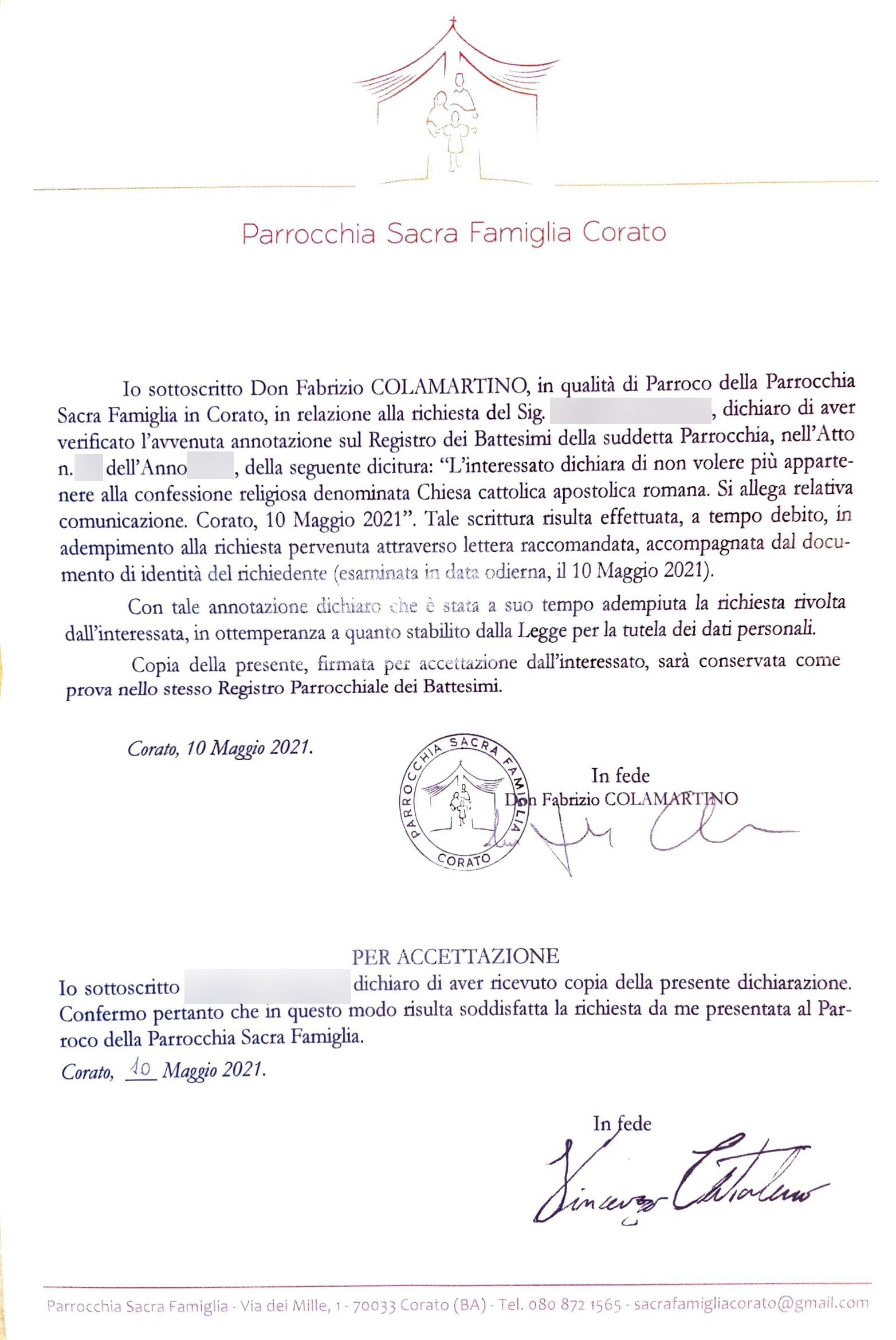 Una persona ha chiesto la rettifica dei dati relativi al proprio battesimo avvenuto a Sacra Famiglia - CORATO (BA) il 10/05/2021, dichiarando di non voler più far parte della Chiesa Cattolica.