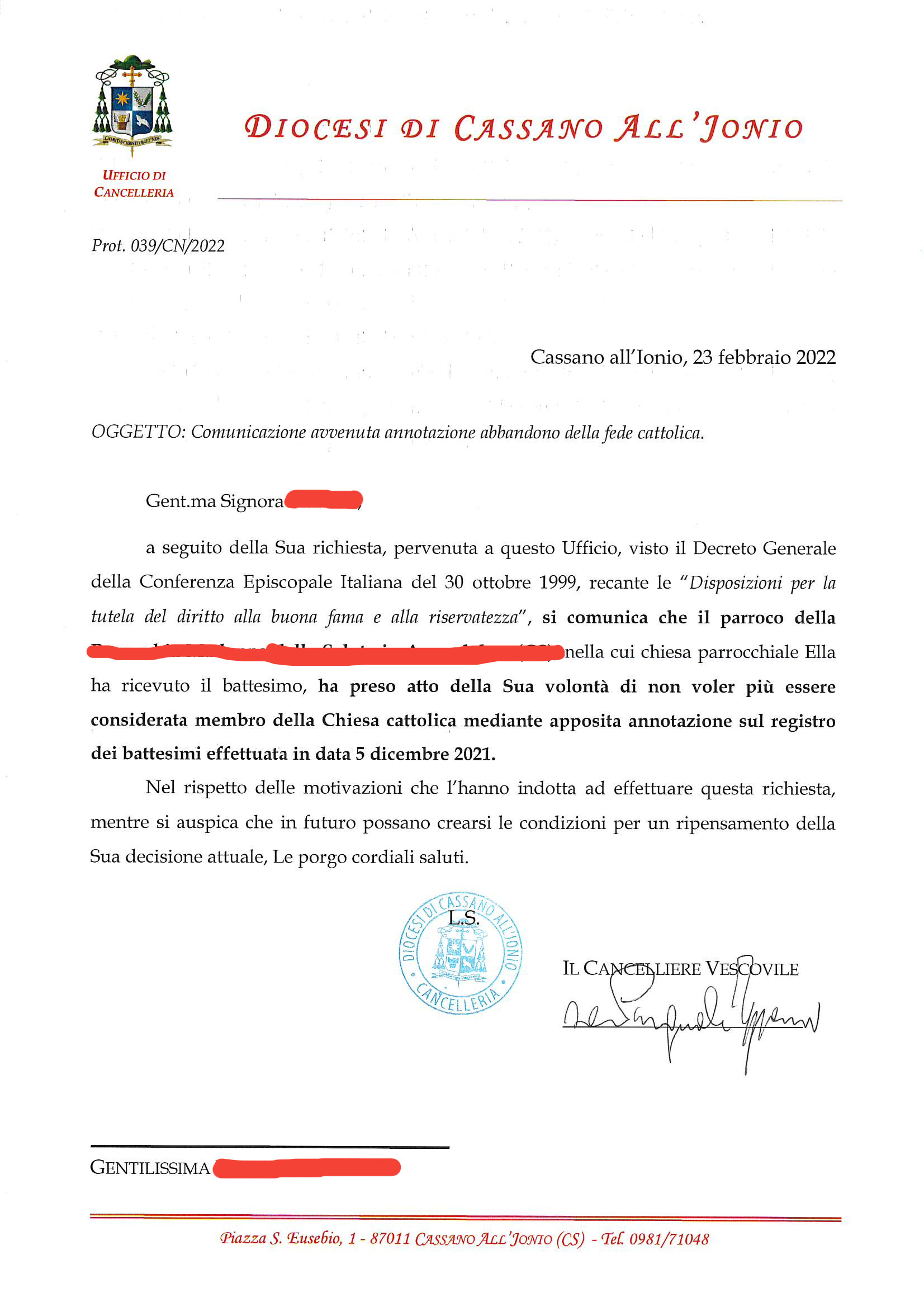 Una persona ha chiesto la rettifica dei dati relativi al proprio battesimo avvenuto a Madonna della Salute - AMENDOLARA (CS) il 23/02/2022, dichiarando di non voler più far parte della Chiesa Cattolica.