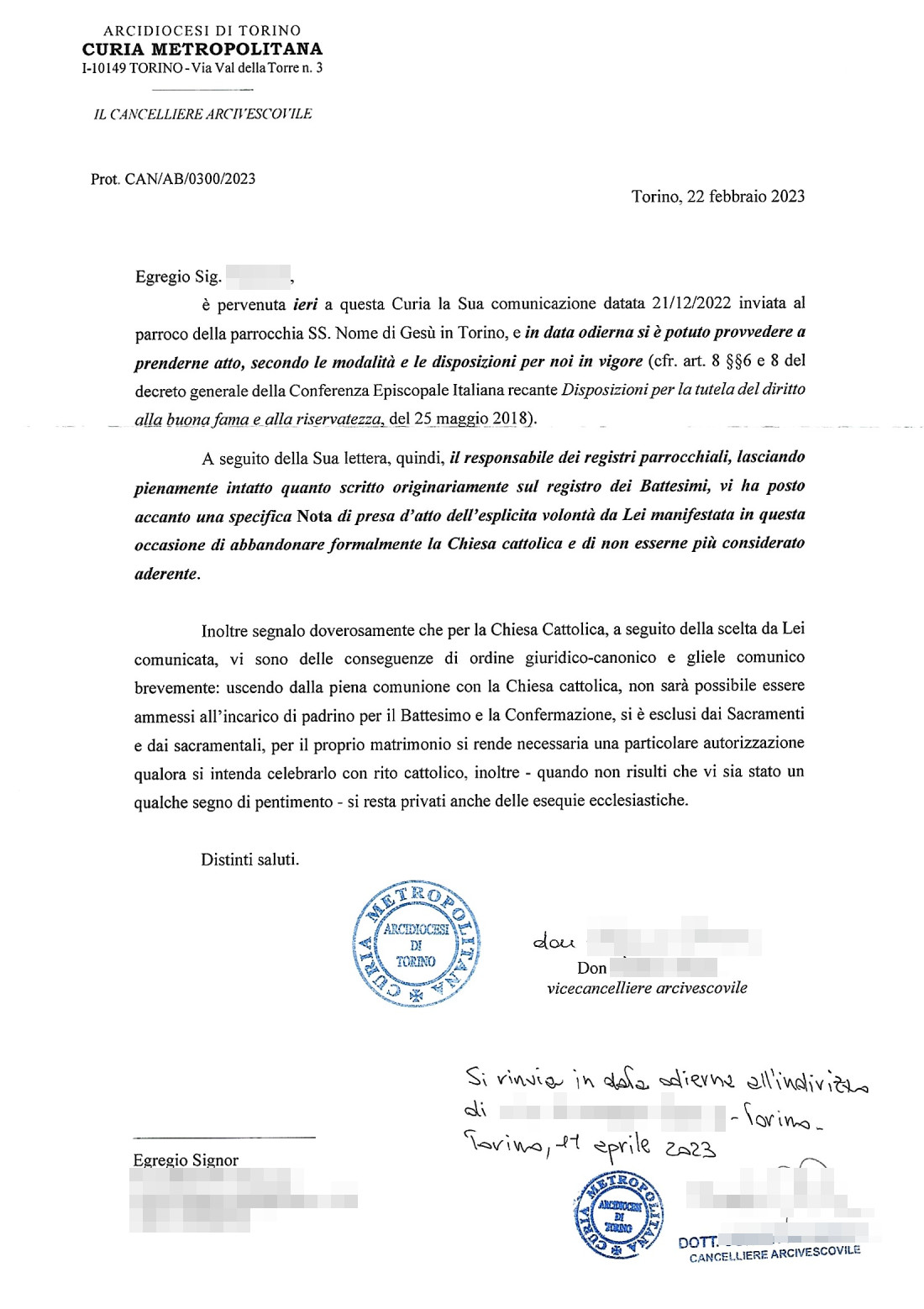 Una persona ha chiesto la rettifica dei dati relativi al proprio battesimo avvenuto a Ss. Nome di Gesù - TORINO (TO) il 13/04/2023, dichiarando di non voler più far parte della Chiesa Cattolica.