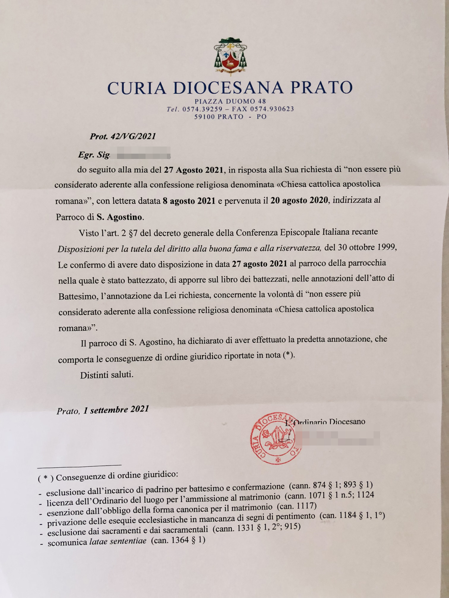 Una persona ha chiesto la rettifica dei dati relativi al proprio battesimo avvenuto a S. Agostino - PRATO (PO) il 27/08/2021, dichiarando di non voler più far parte della Chiesa Cattolica.