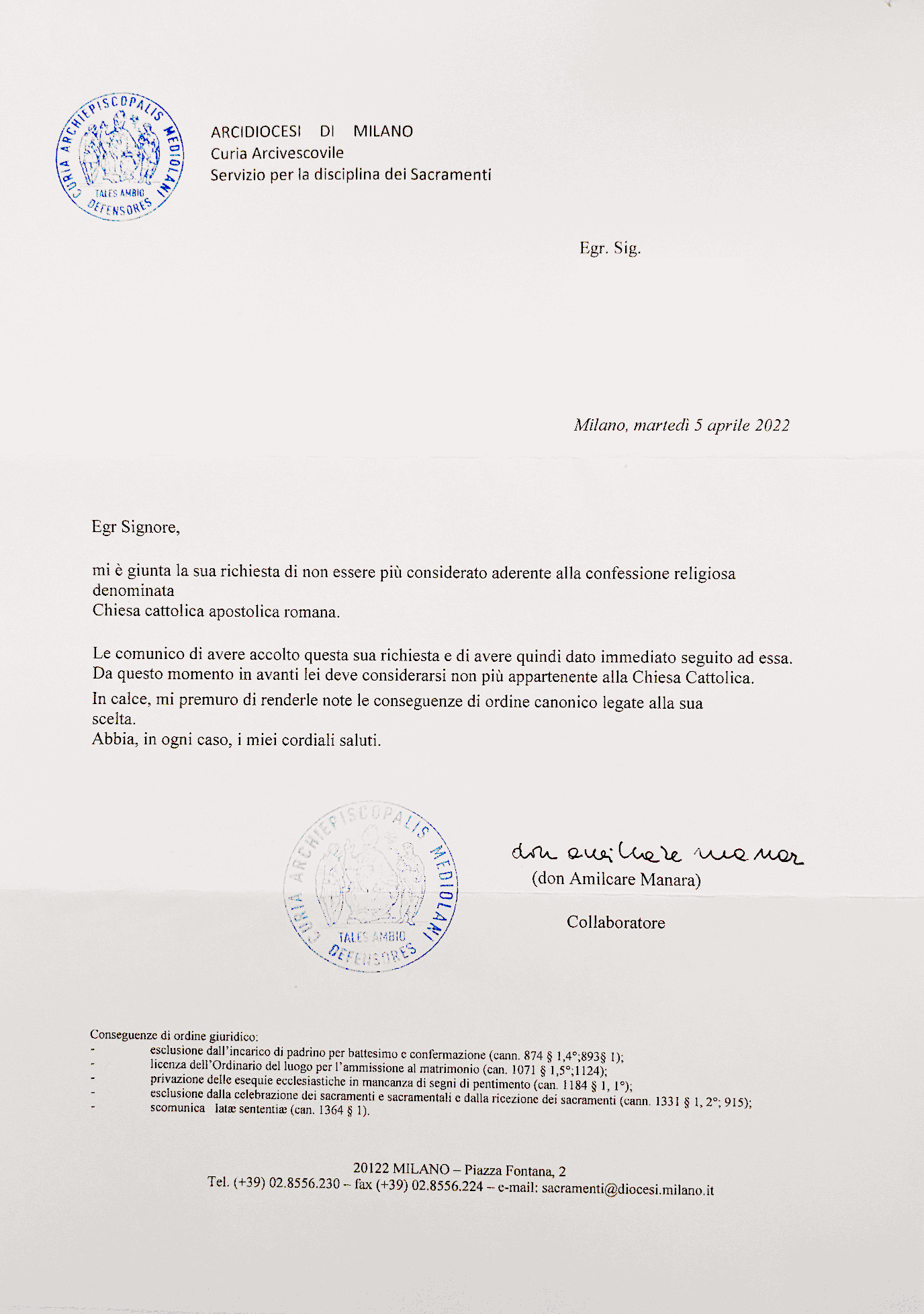 Una persona ha chiesto la rettifica dei dati relativi al proprio battesimo avvenuto a Santi Mm. Gervaso e Protaso - TREZZO SULL'ADDA (MI) il 05/04/2022, dichiarando di non voler più far parte della Chiesa Cattolica.