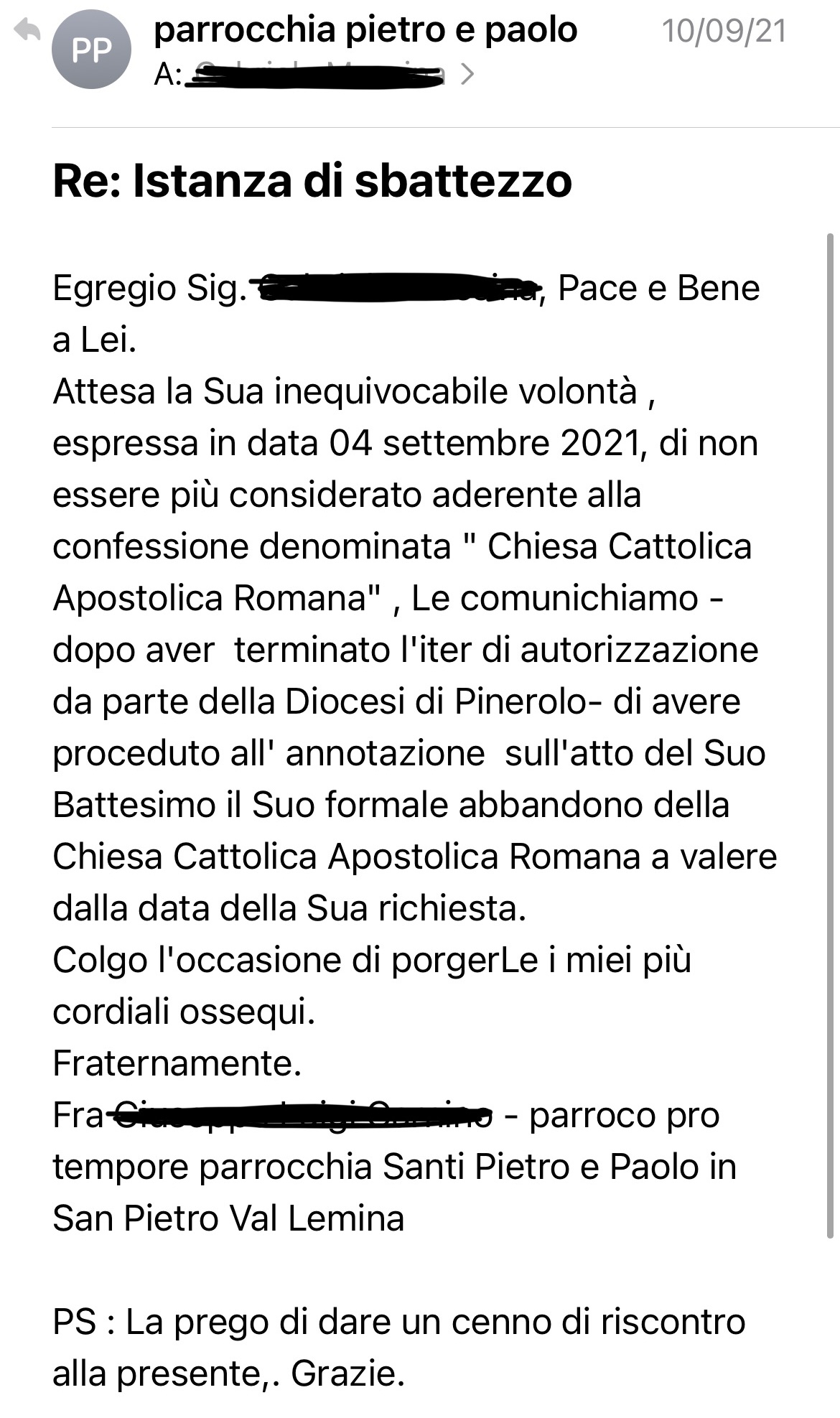 Una persona ha chiesto la rettifica dei dati relativi al proprio battesimo avvenuto a Santi Pietro e Paolo - SAN PIETRO VAL LEMINA (TO) il 10/09/2021, dichiarando di non voler più far parte della Chiesa Cattolica.