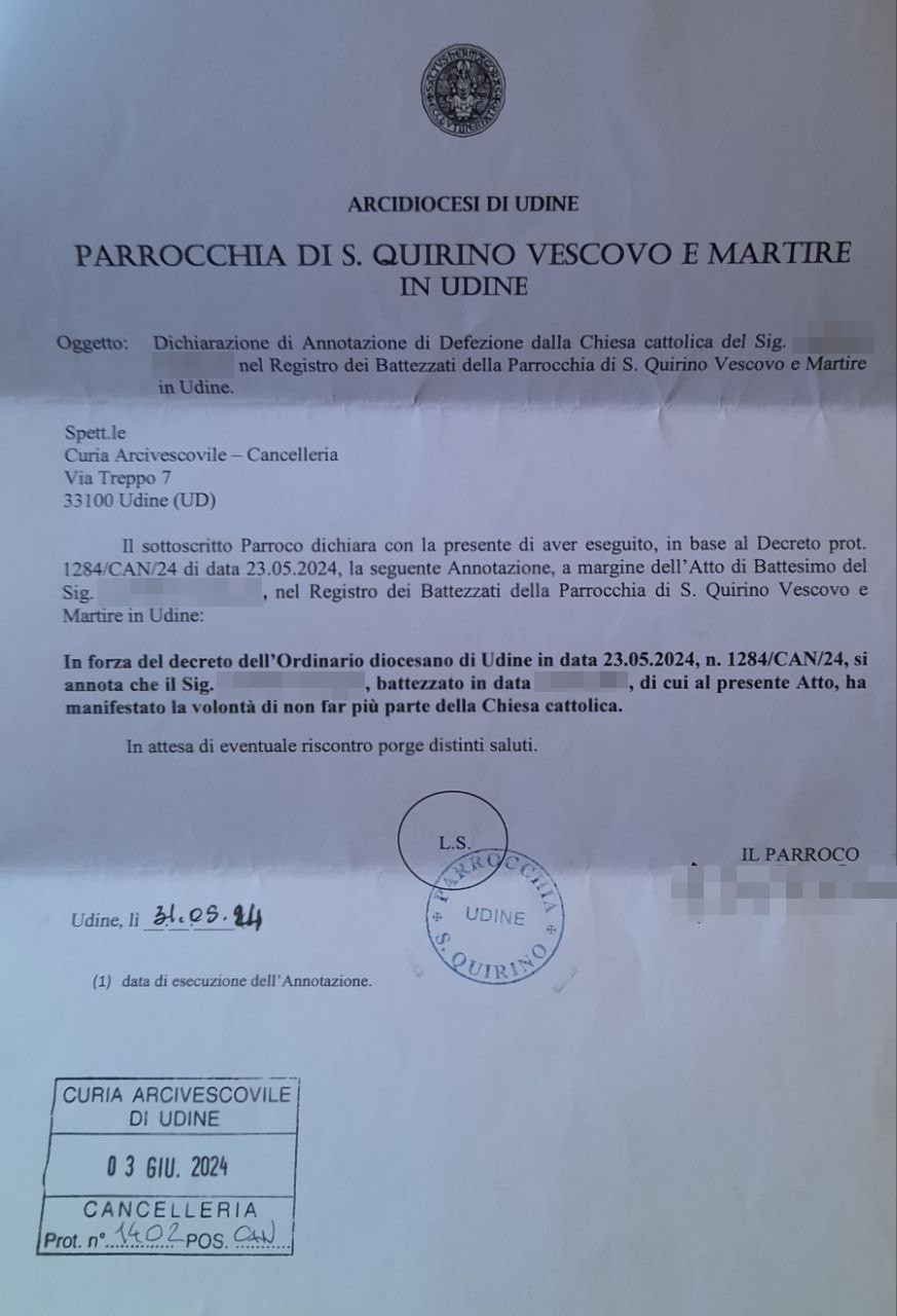 Una persona ha chiesto la rettifica dei dati relativi al proprio battesimo avvenuto a S. Quirino Vescovo e Martire - UDINE (UD) il 03/06/2024, dichiarando di non voler più far parte della Chiesa Cattolica.