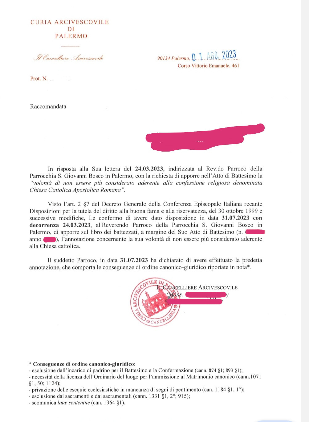 Una persona ha chiesto la rettifica dei dati relativi al proprio battesimo avvenuto a S. Giovanni Bosco - PALERMO (PA) il 01/08/2023, dichiarando di non voler più far parte della Chiesa Cattolica.